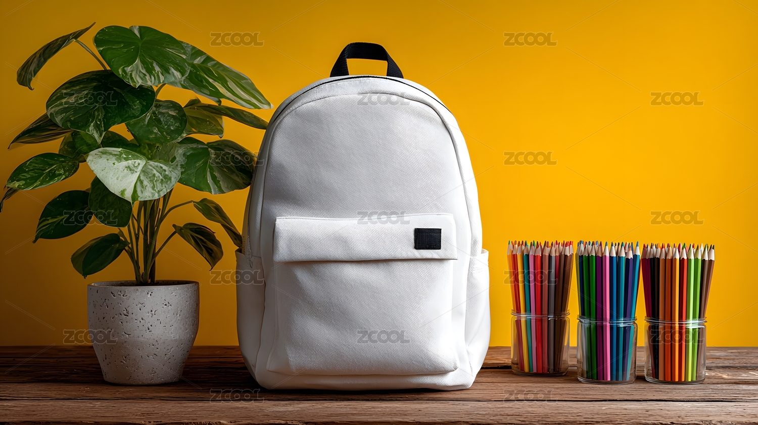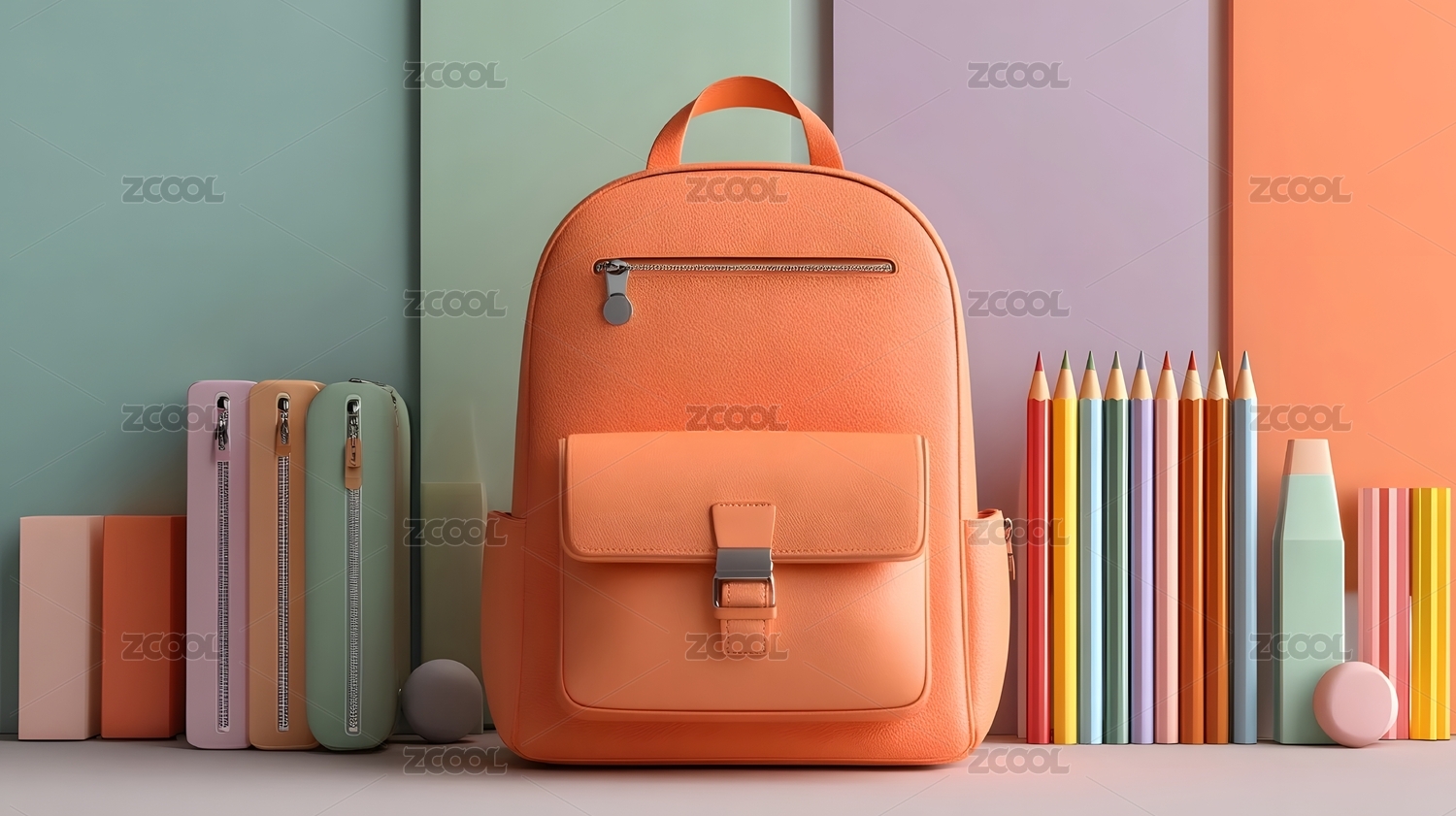 白背包与彩笔装饰背景 学生用品静物