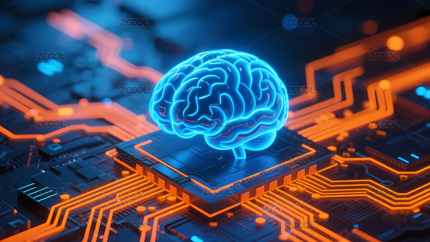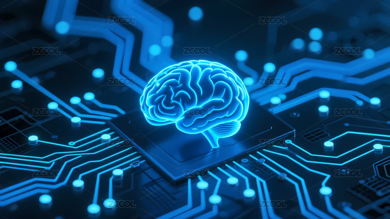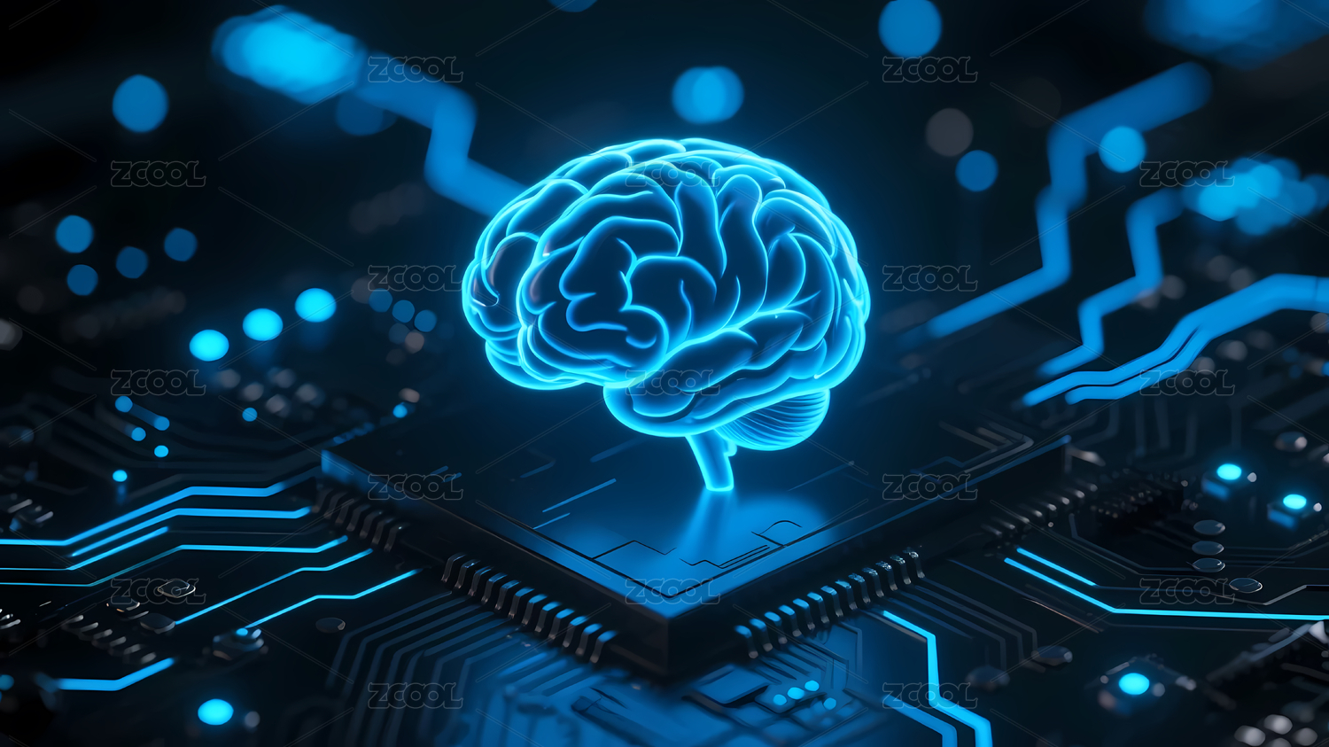 蓝色发光大脑与电路板图案