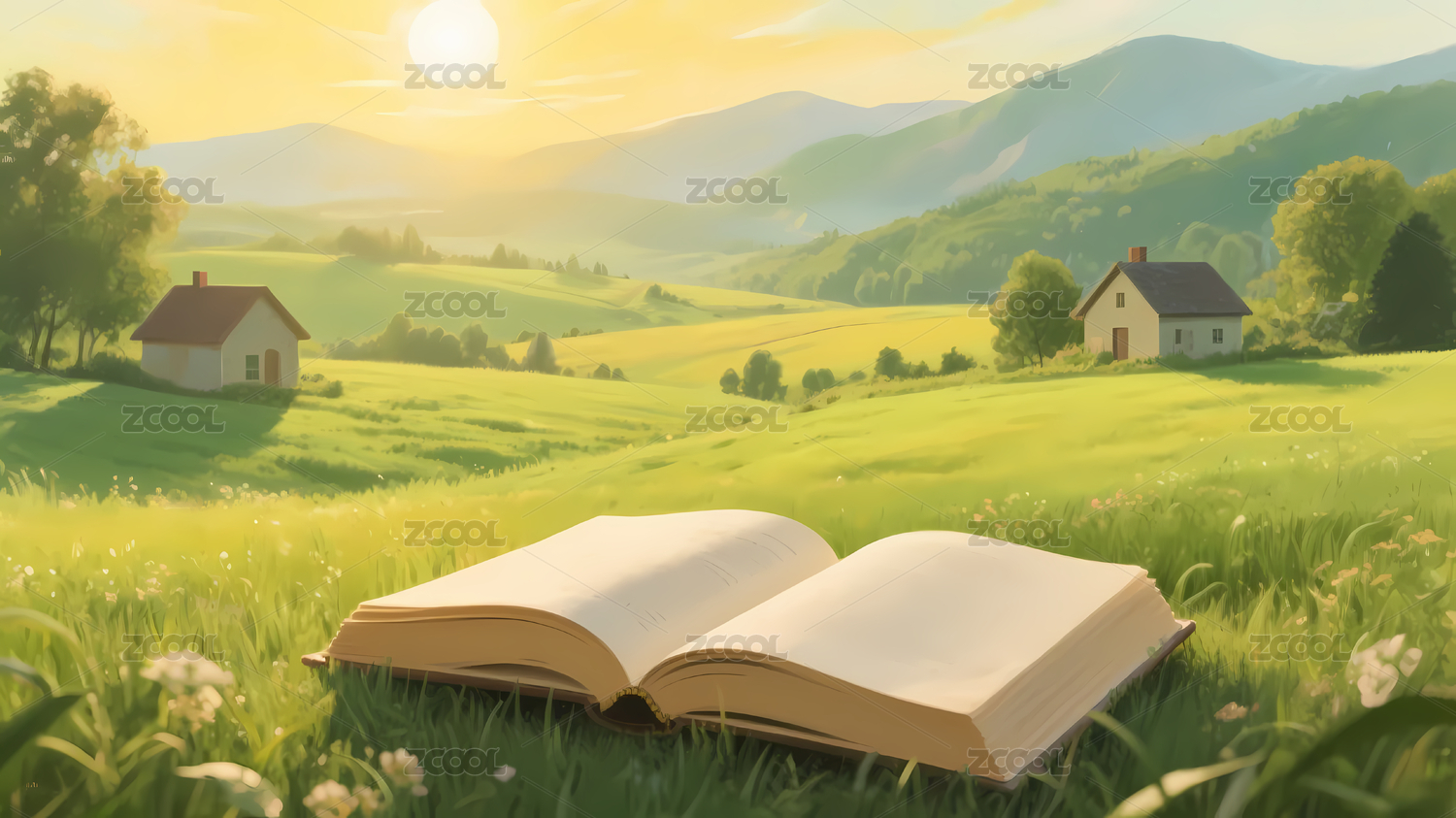 草地,书本,书籍,铅笔,蓝天,花朵,插画,教育,学习,自然