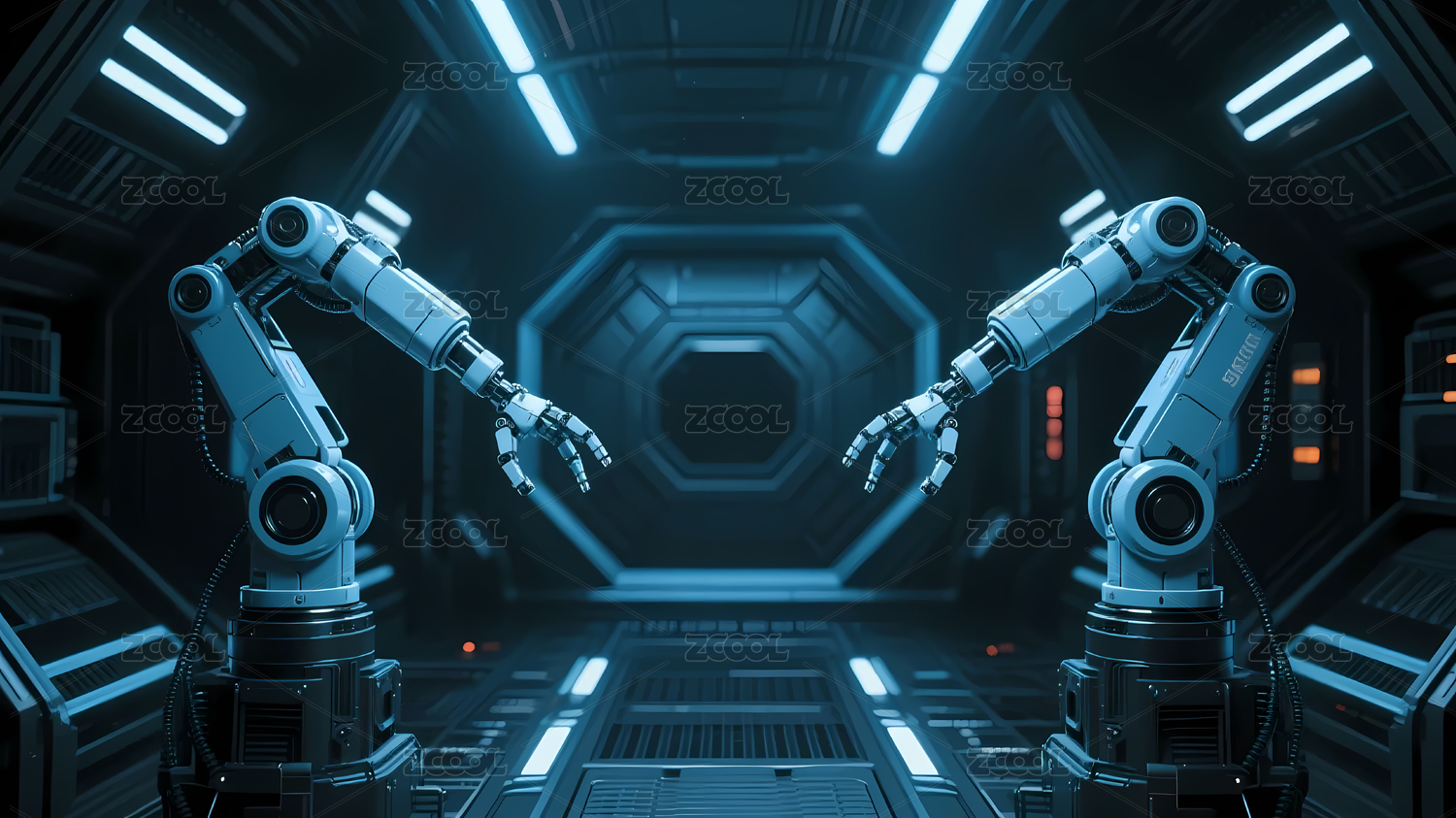 蓝灰机械臂与科幻走廊