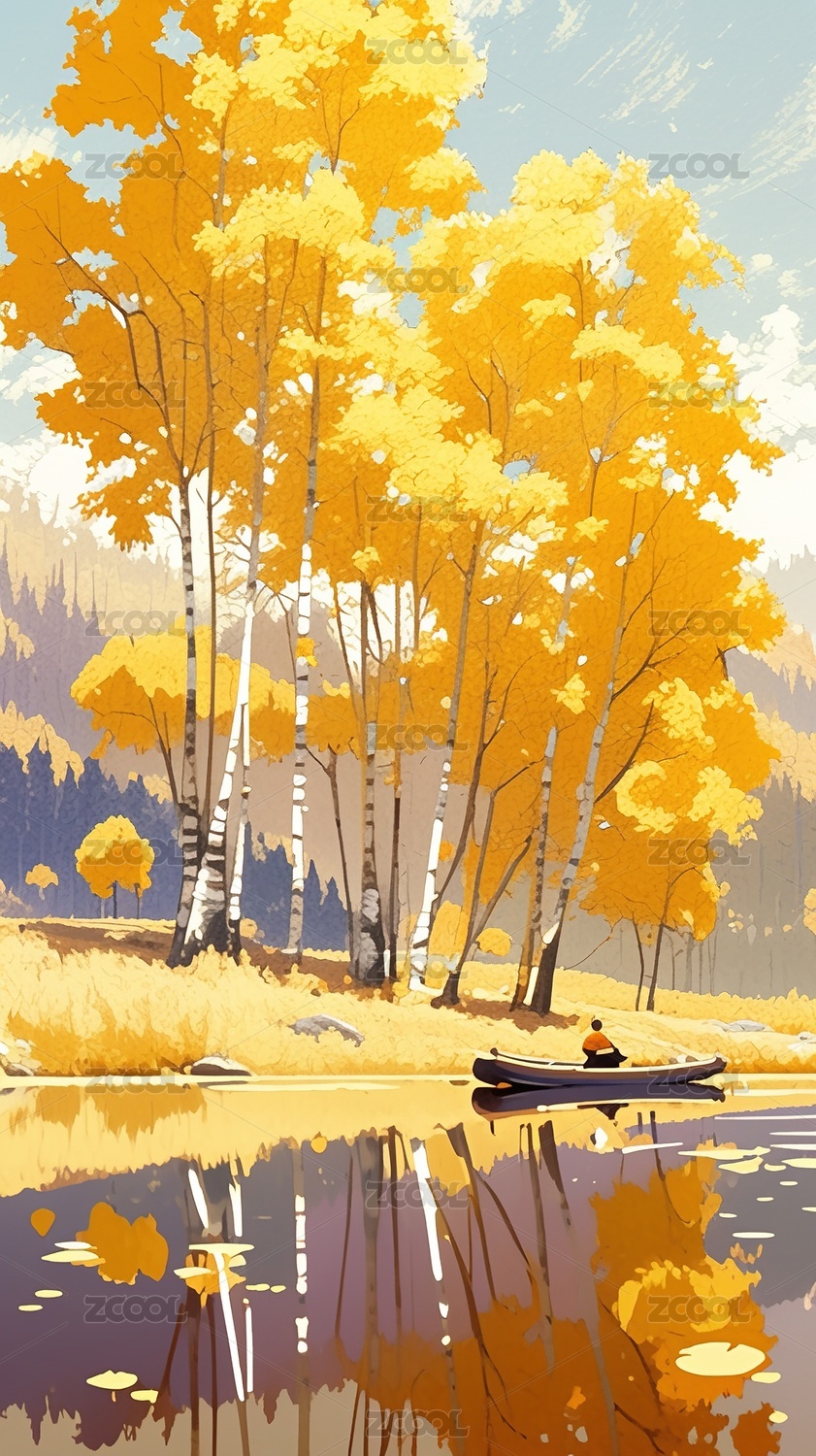 湖泊,湖水,树木,山峦,天空,白云,秋景,风景,自然,插画