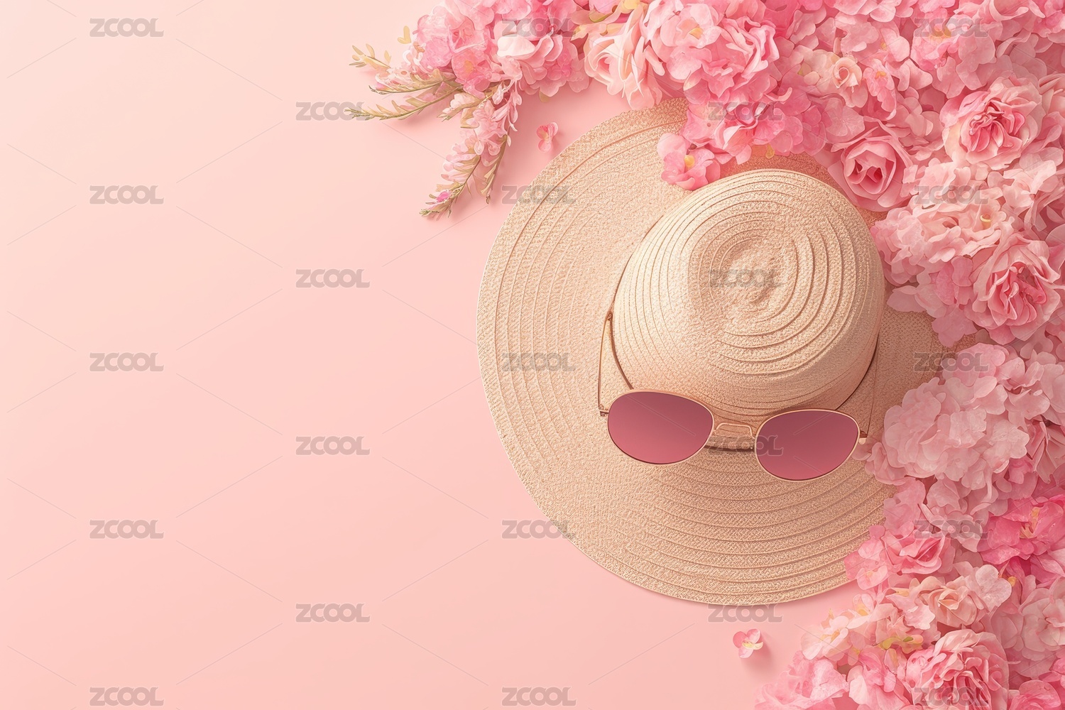 粉色,背景,柔和,温馨,色调,草帽,宽边,米白色,休闲,度假