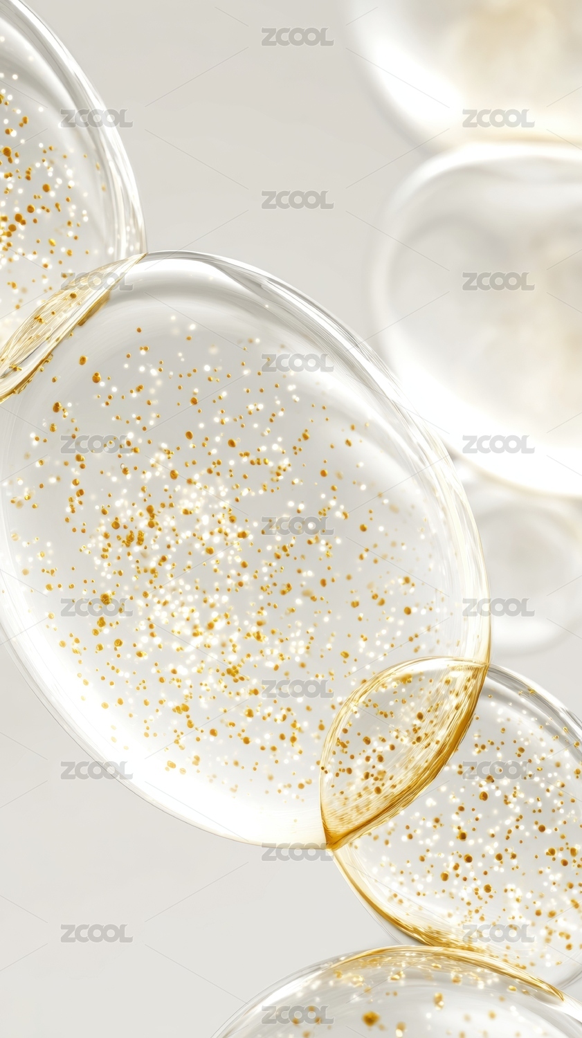 金色颗粒悬浮于透明液体中