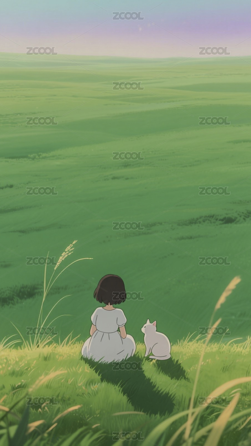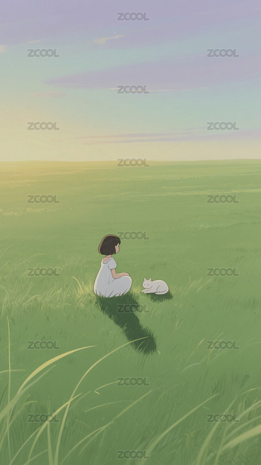 田野上的女孩与猫