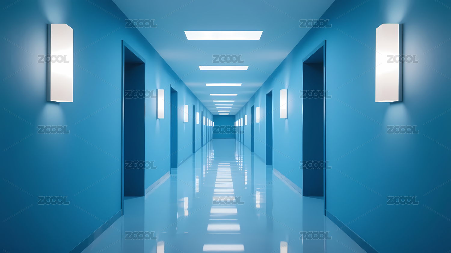 深色,走廊,对称,冷色,门,壁灯,灯具,地面,天花板,反光