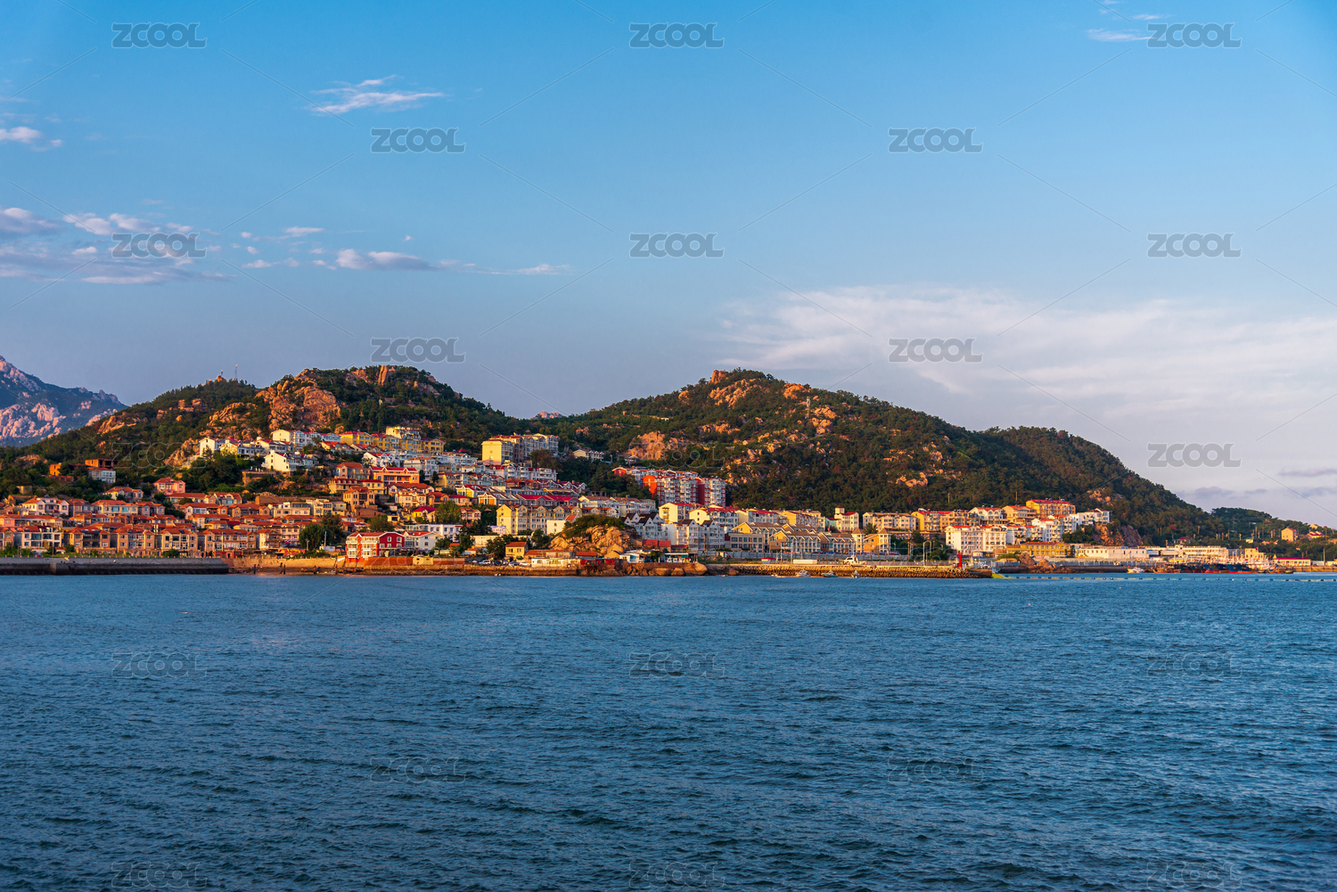 日落时分,宁静的海滨城市与山脉背景