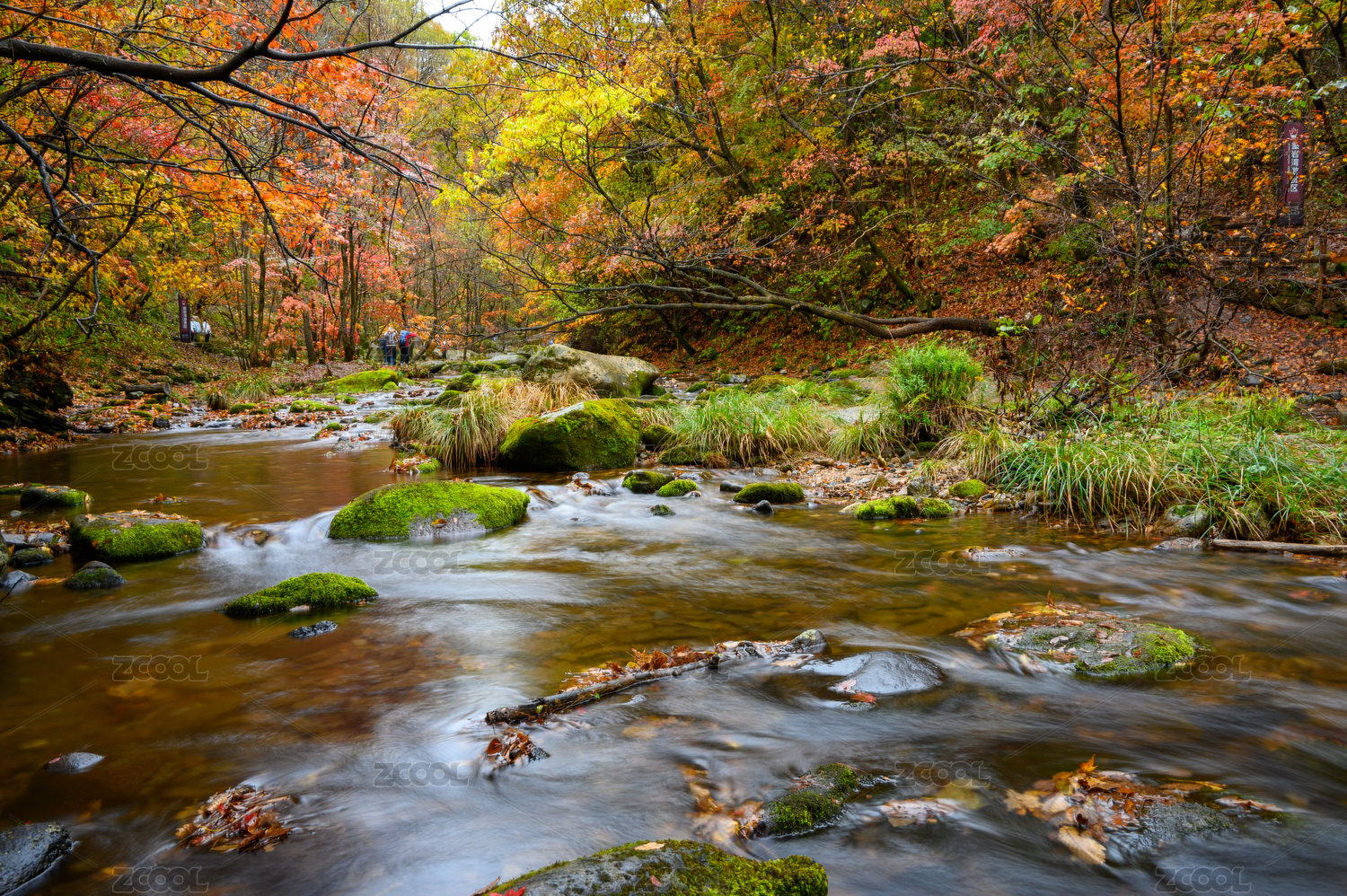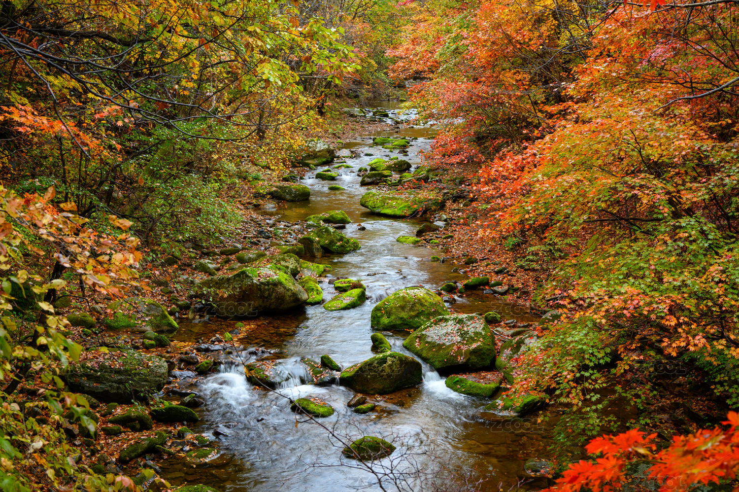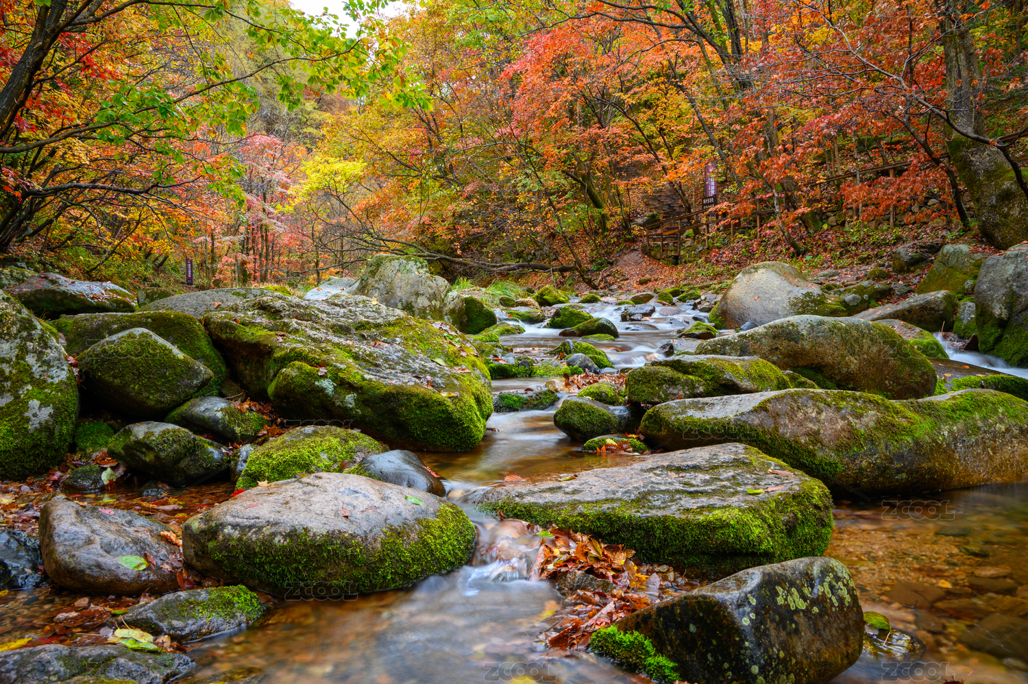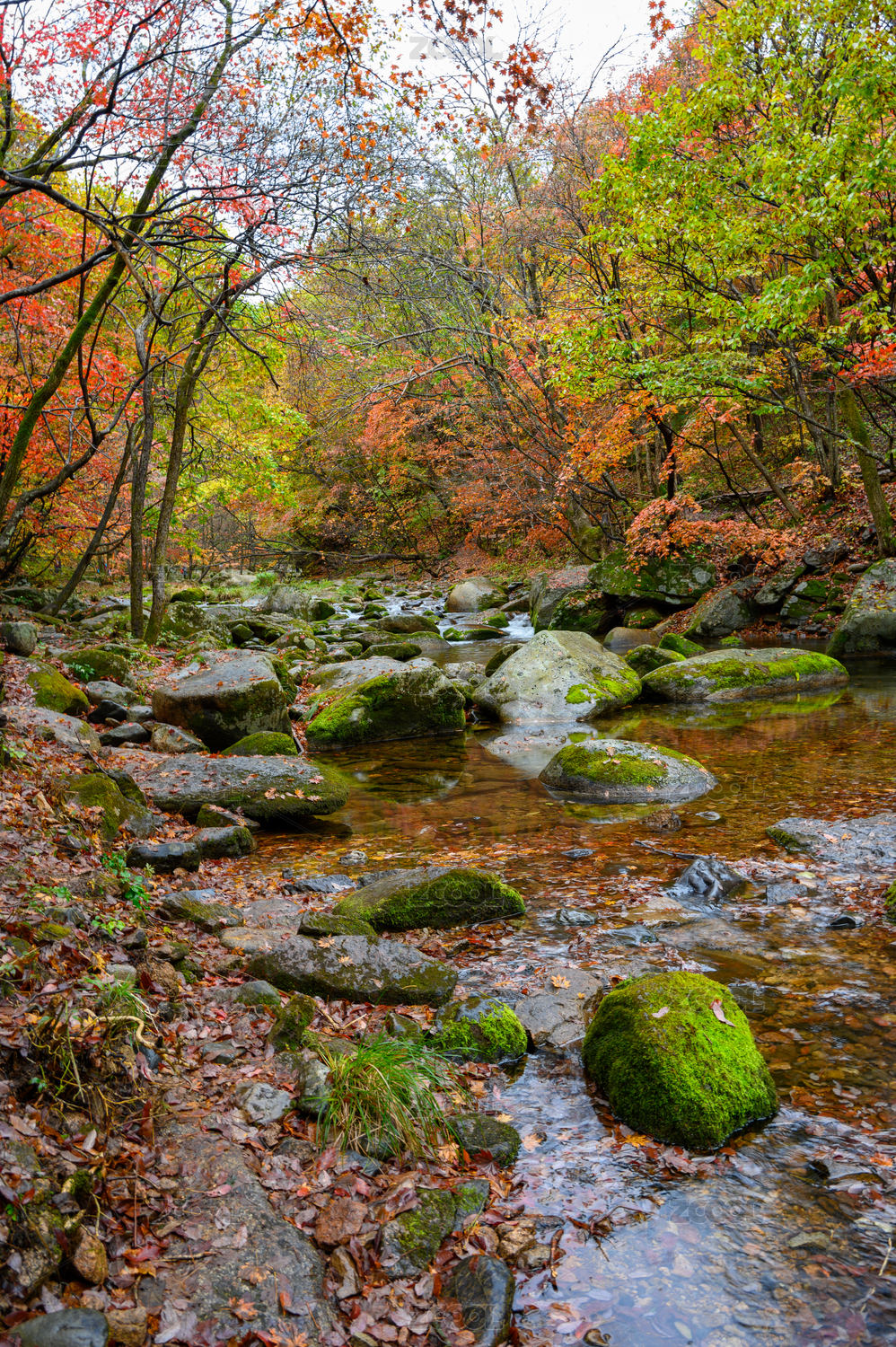 秋天,红叶,枫叶,溪流,流水,河流,石头,青苔,苔藓,秋季