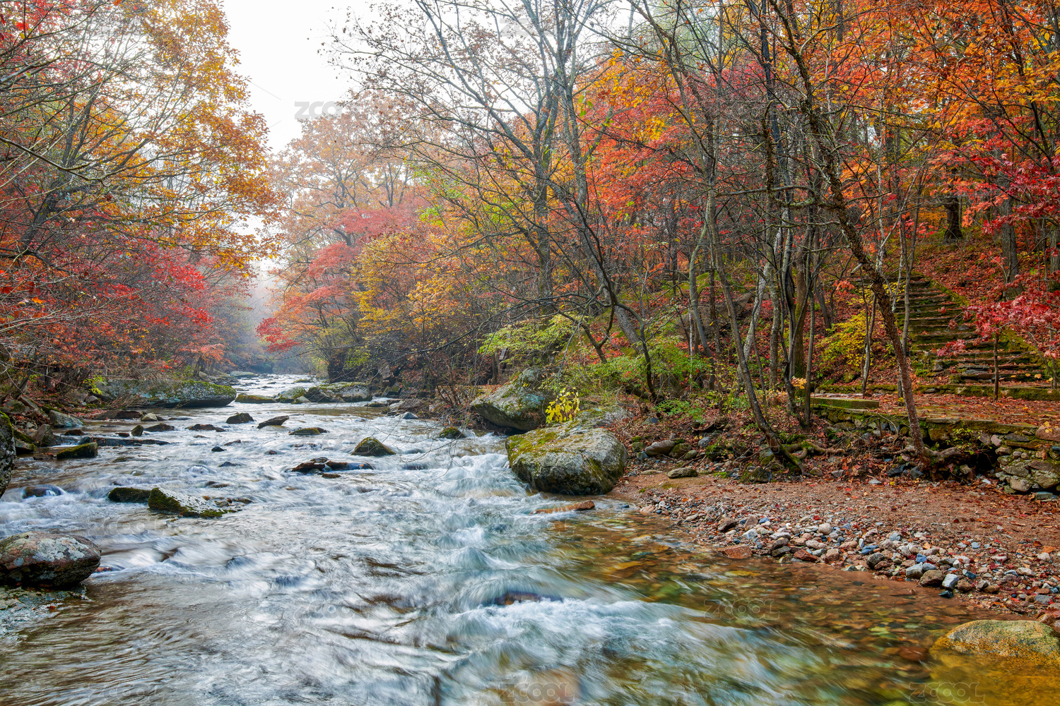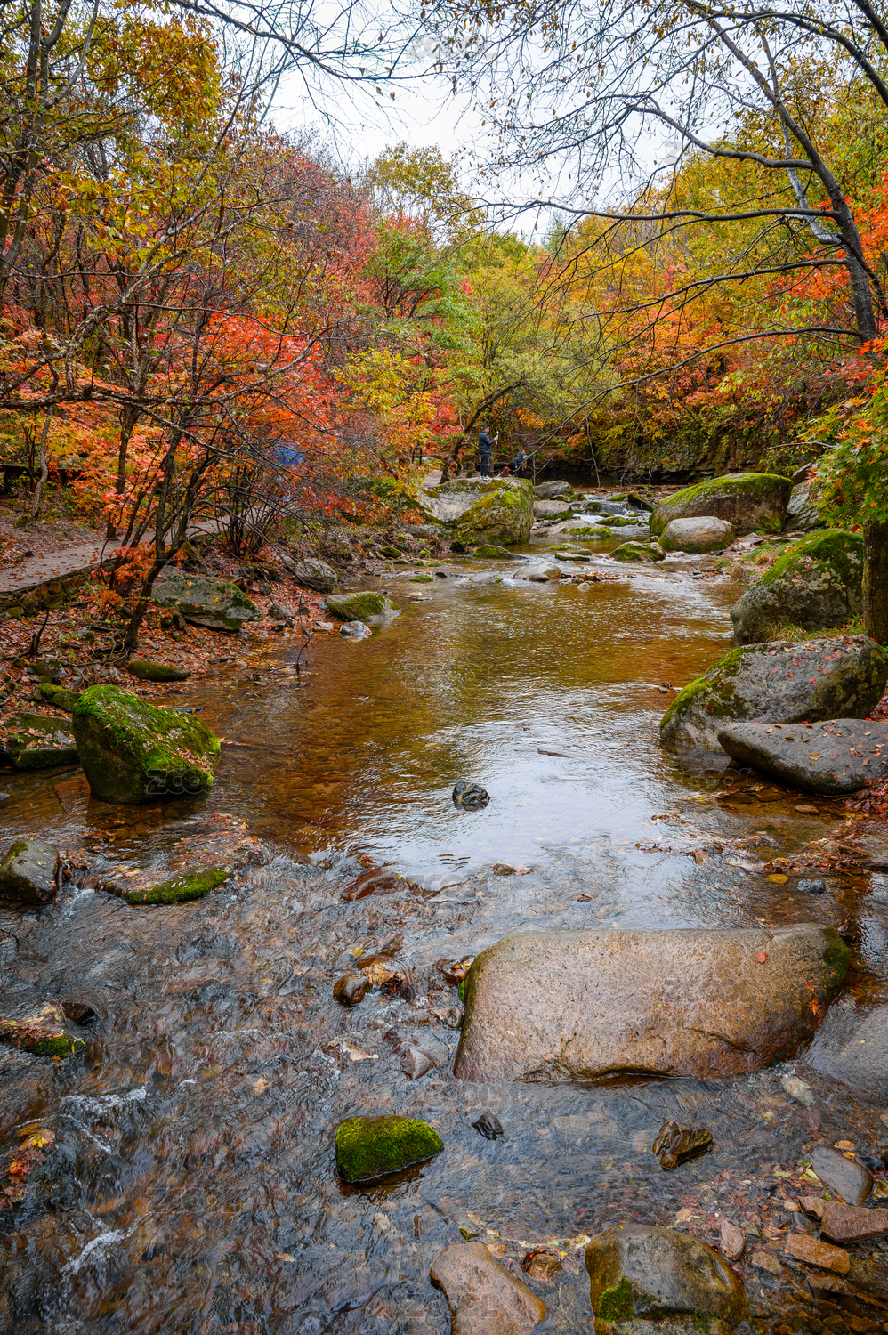 沈阳本溪老边沟,秋季枫树红叶溪流自然风光