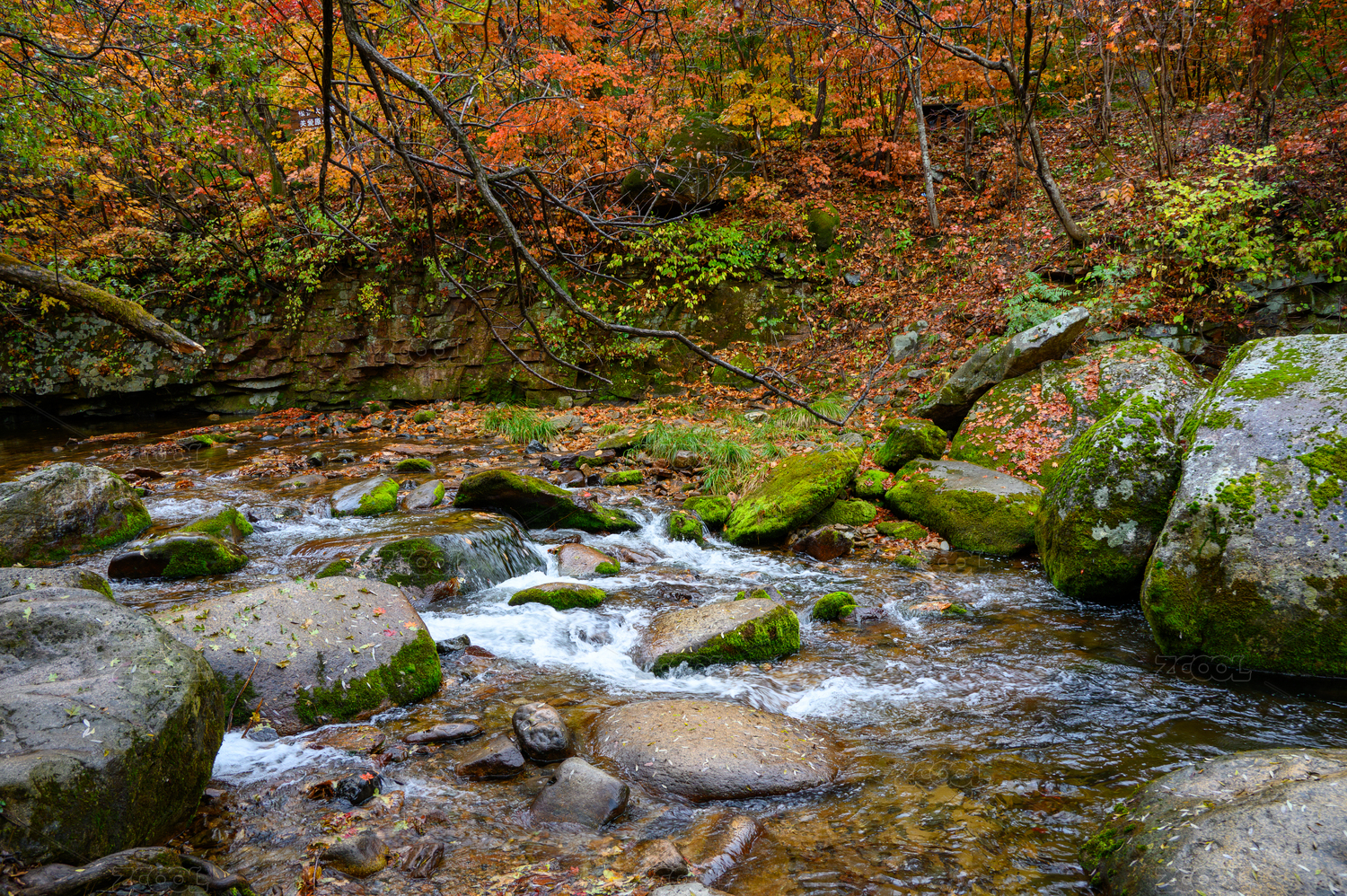 沈阳本溪老边沟,秋季石头溪流落叶自然风光