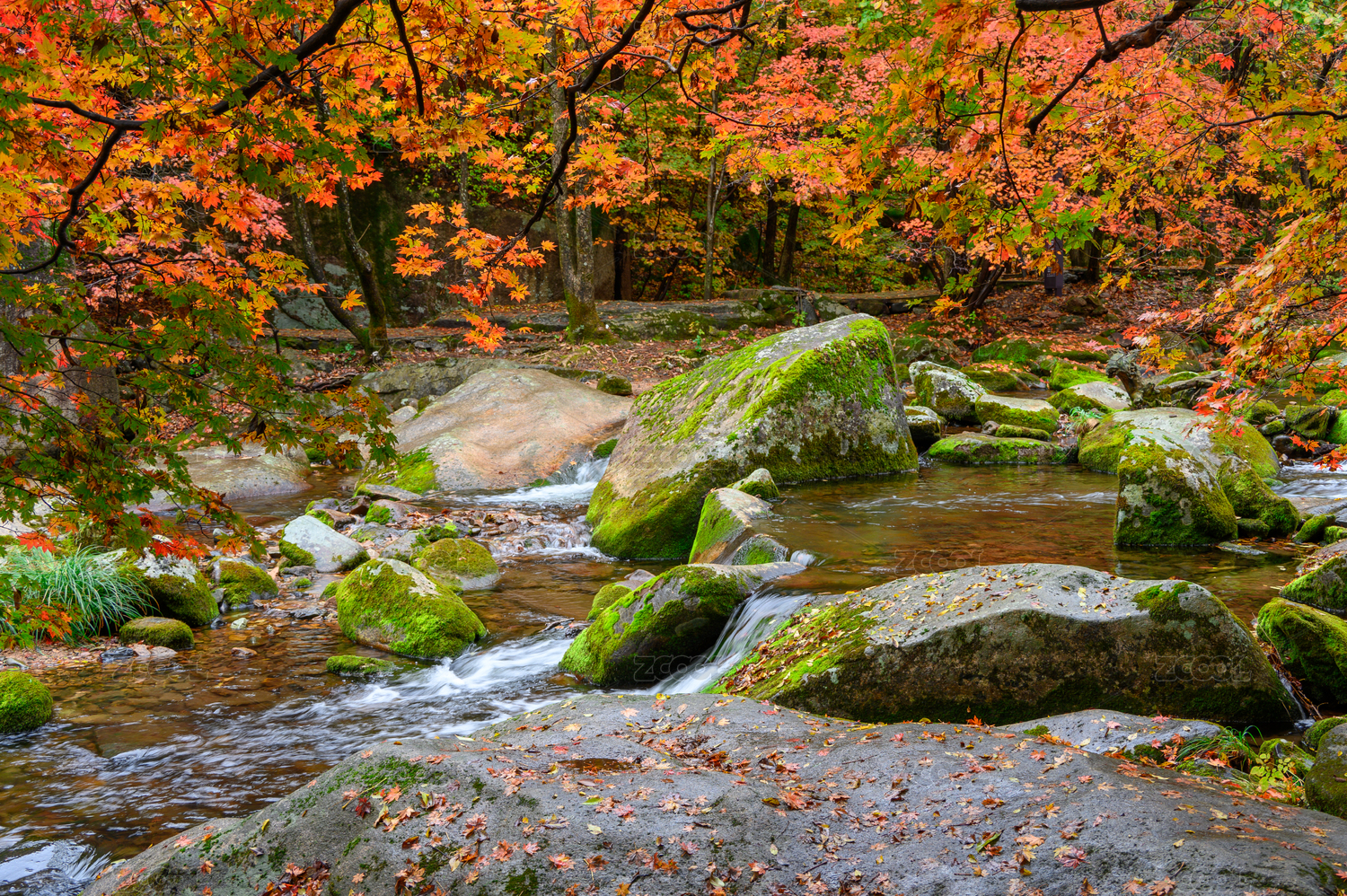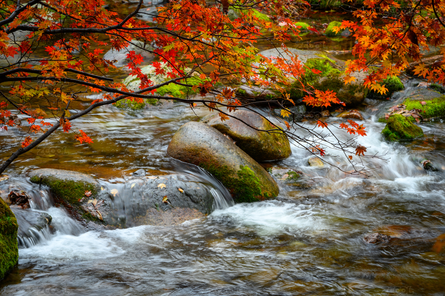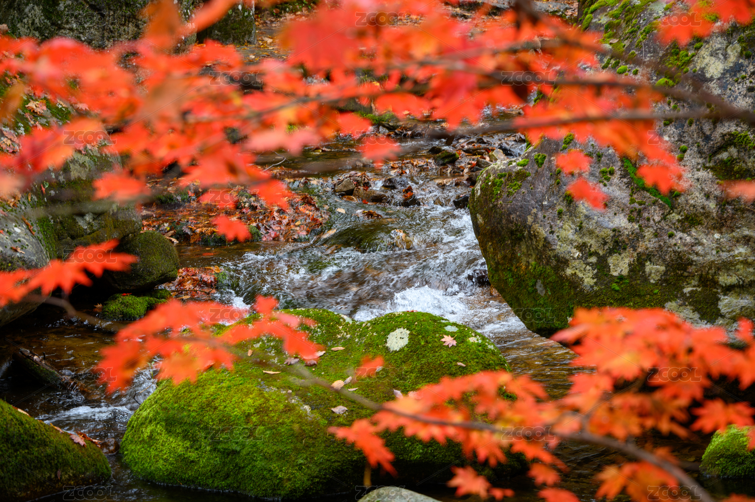 秋天,红叶,枫叶,溪流,流水,河流,石头,青苔,苔藓,秋季