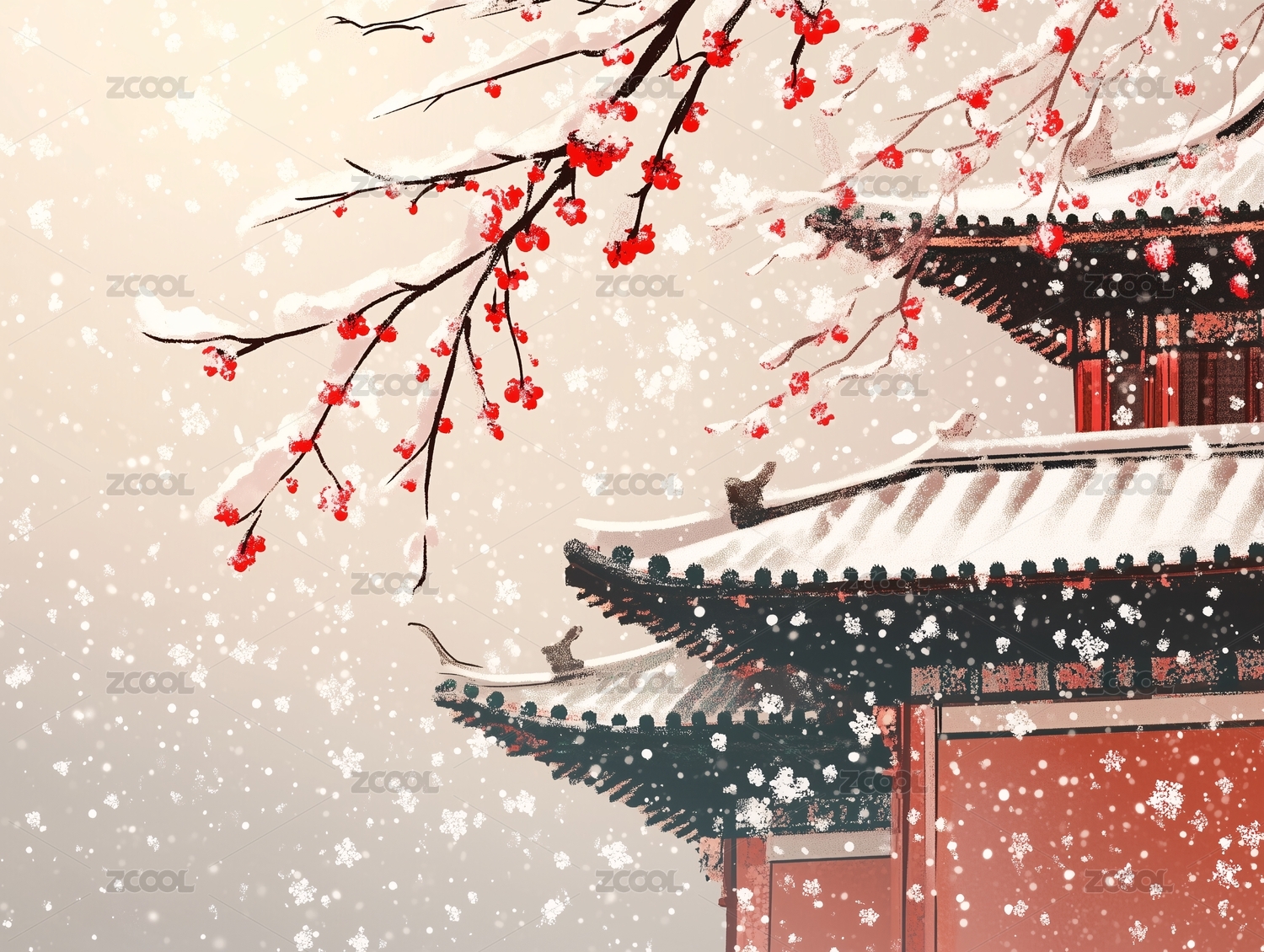立冬水彩冬天红墙绿瓦红梅梅花风景雪景