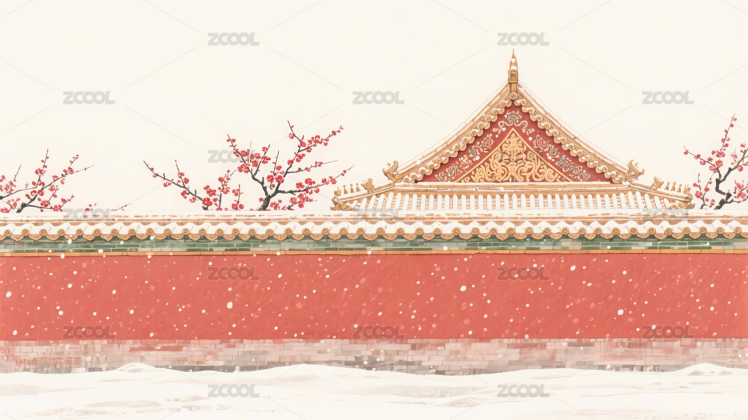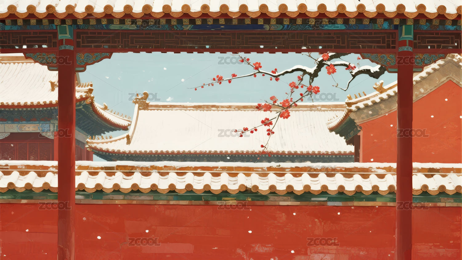 红墙,雪景,古建筑,冬天,中国风,传统文化,白雪,红门,庭院,积雪