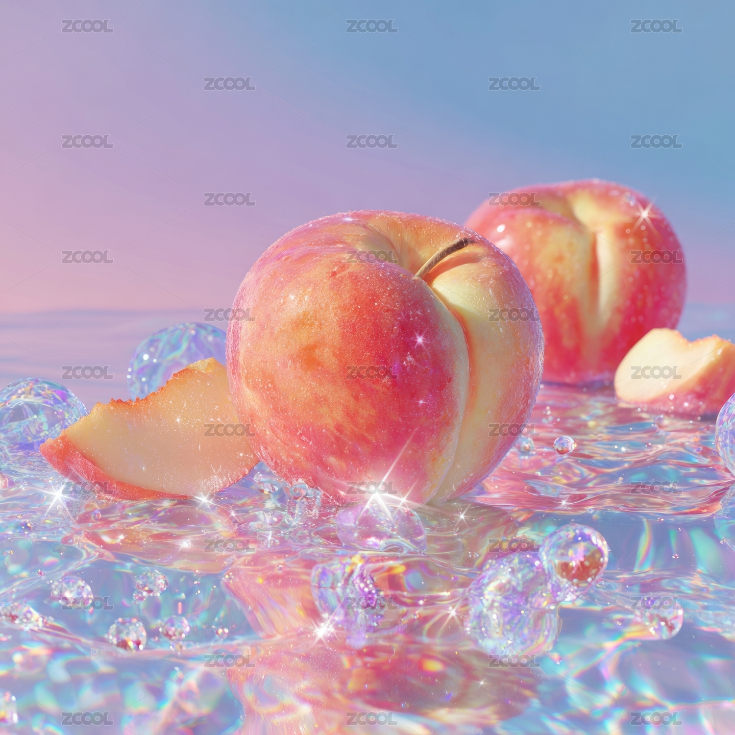 水蜜桃,桃子,水果,插画,半切面,粉嫩,多汁,阳光,绿叶,清新