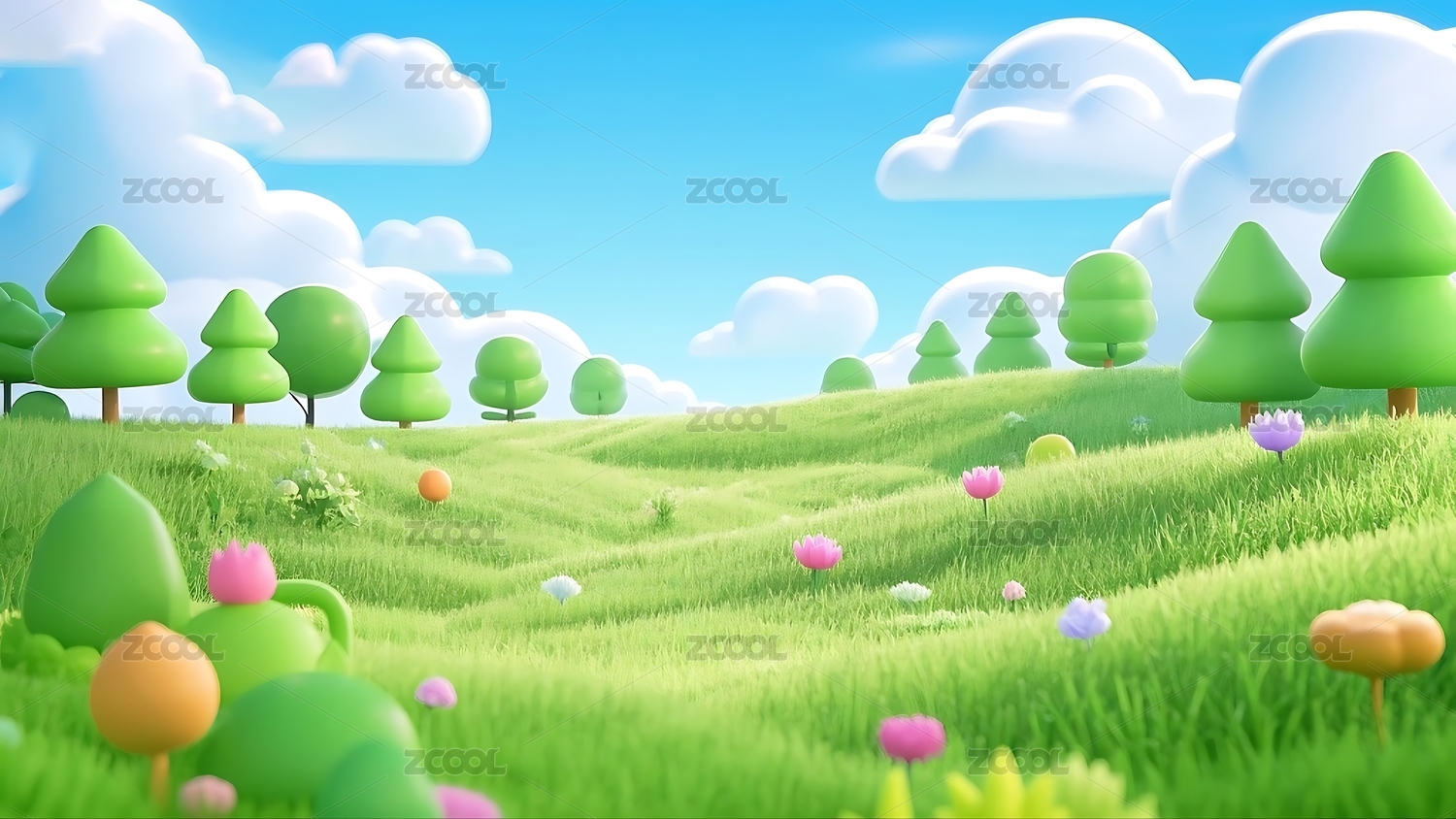 卡通风景,绿色山谷,蓝天白云,雪山远景,毛绒树木,草地花卉,童话场景,可爱树木,春天风景,自然风光