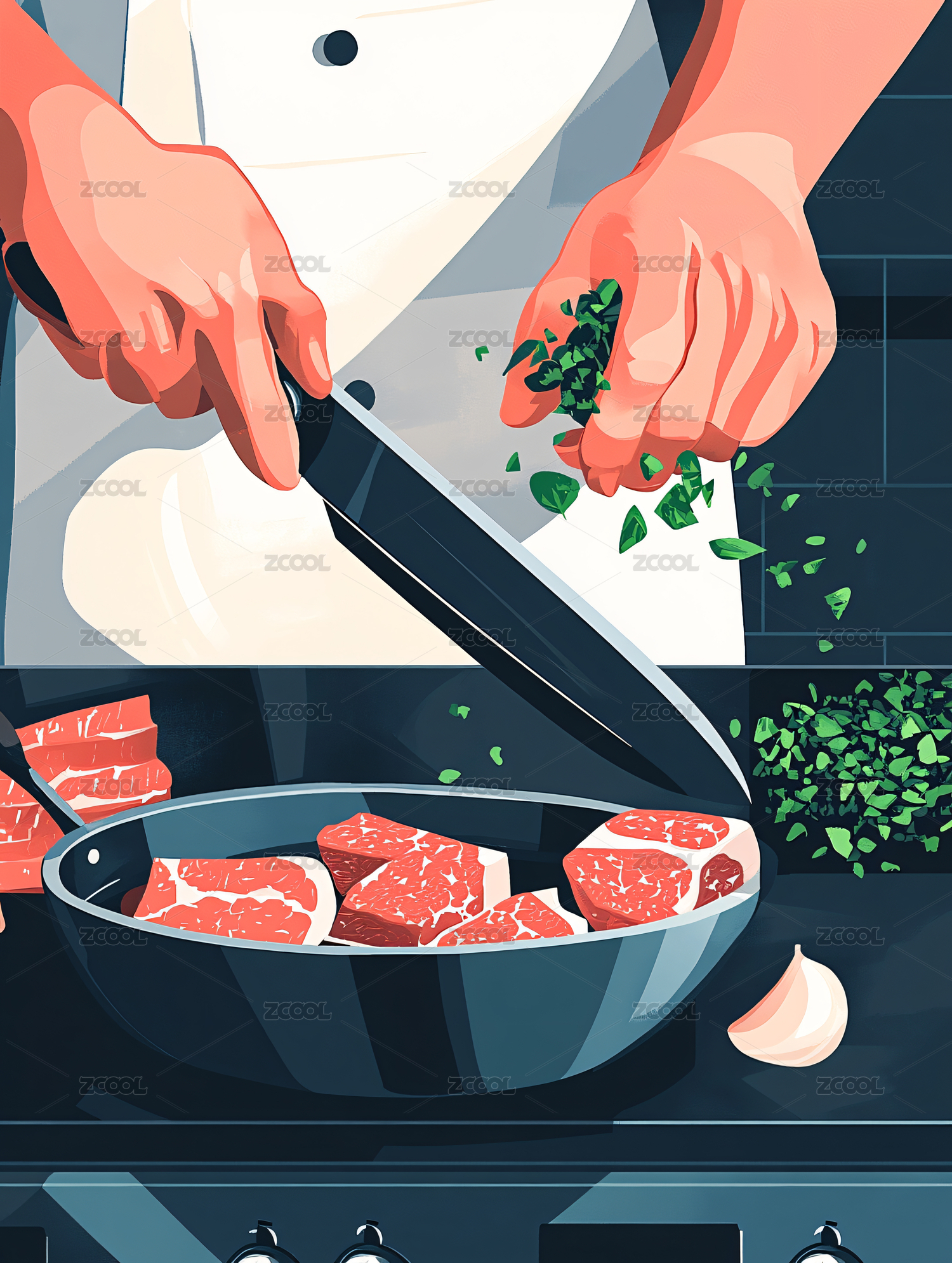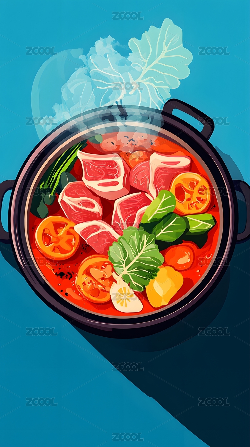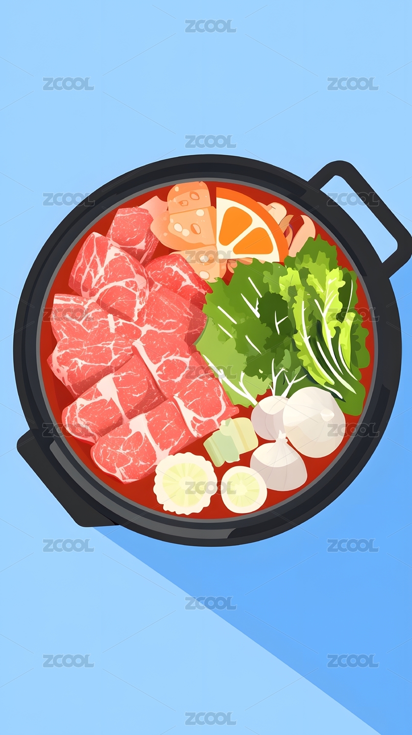 热气腾腾的美味自助火锅 牛肉蔬菜菌菇蛋糕卡通动漫风的矢量插画