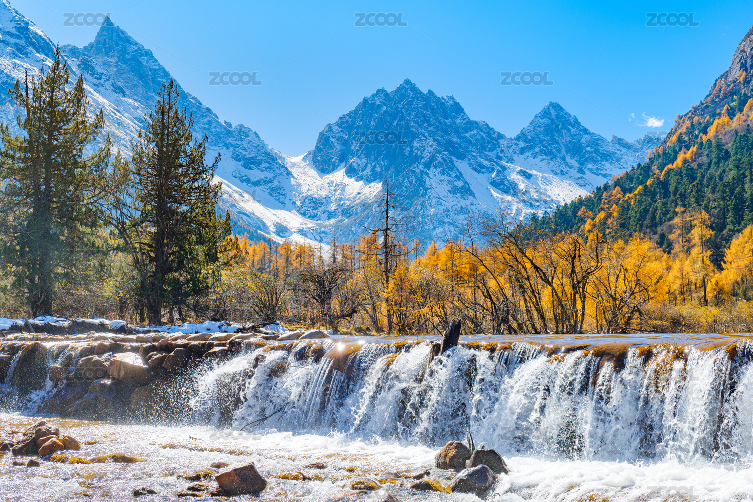 中国川西毕棚沟初冬晴天的雪山与湖泊瀑布