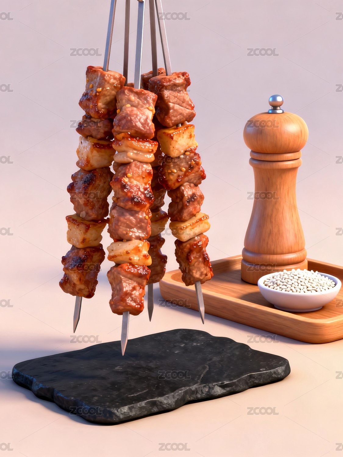 洒辣椒面的烧烤竹签串着的麻辣烤串烤里脊肉