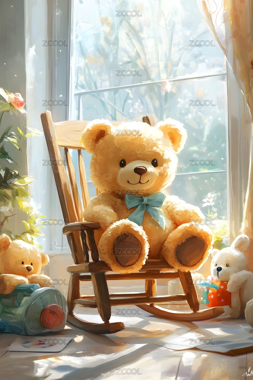 柔和光线下棕色布偶小熊坐在复古摇椅上