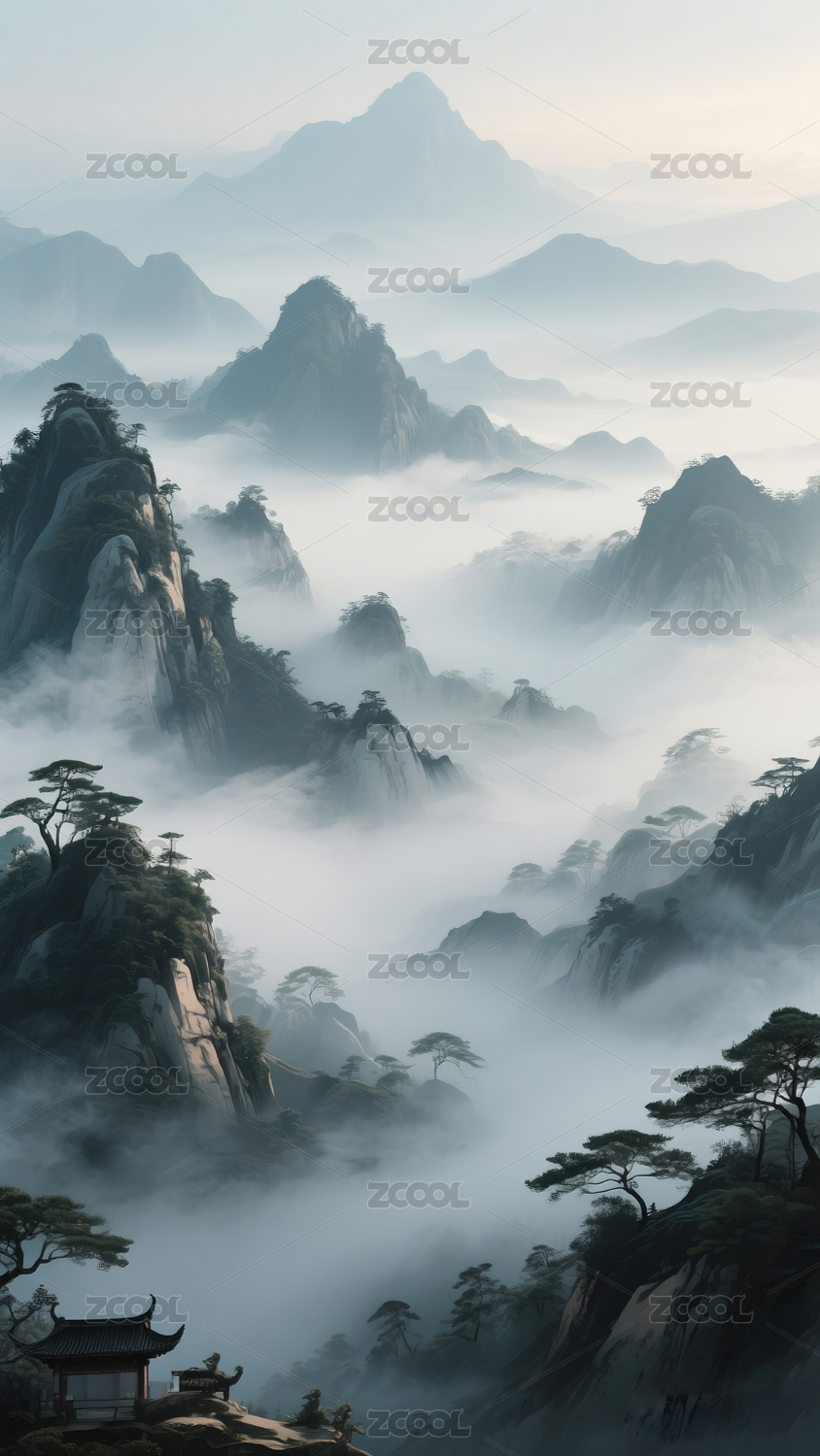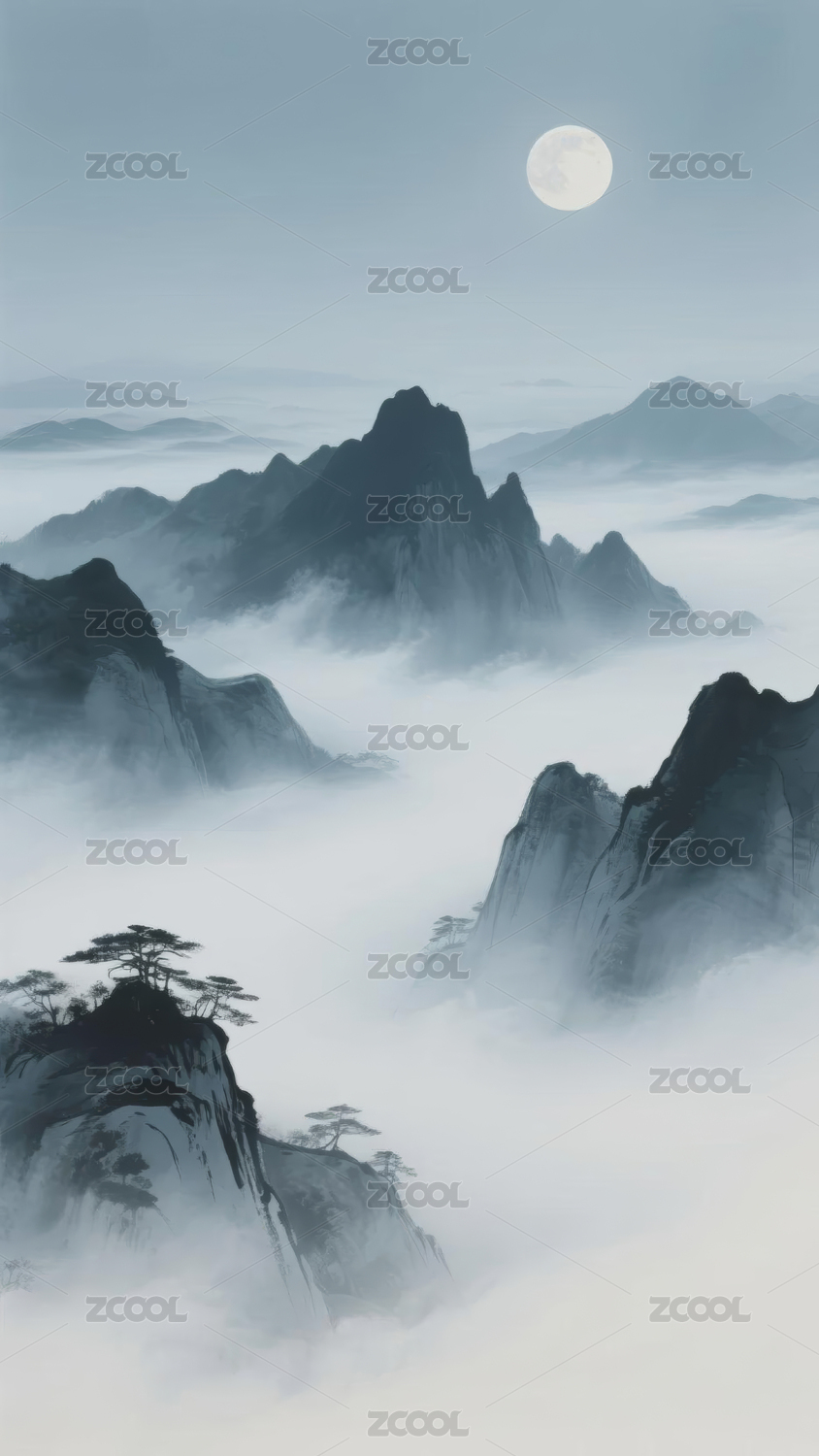 月下山水雾景