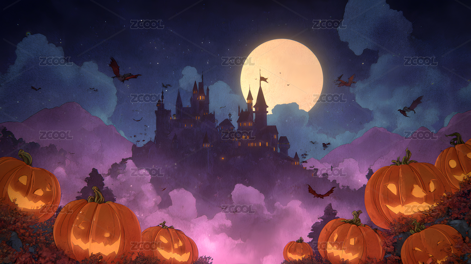 万圣节夜晚城堡月亮南瓜背景壁纸
