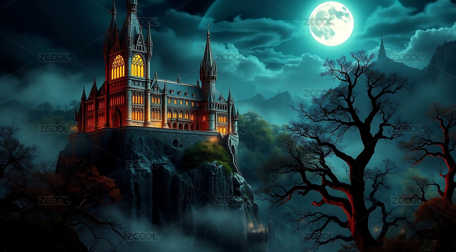 月夜下的魔幻神秘城堡