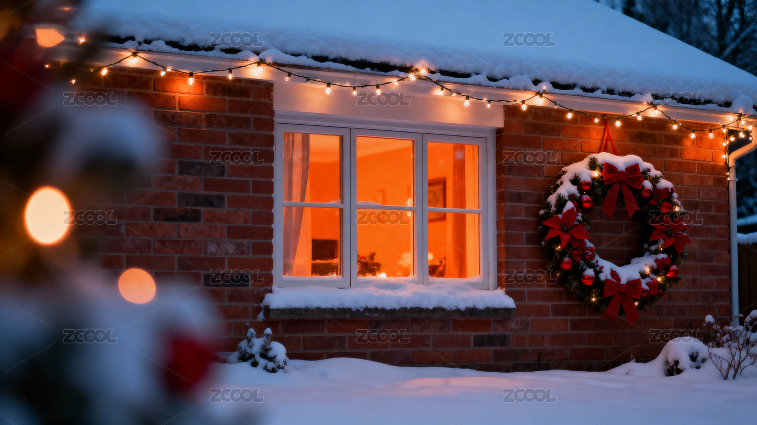 夜晚,灯串,围栏,节日,装饰,雪,窗户,花环,圣诞,白色