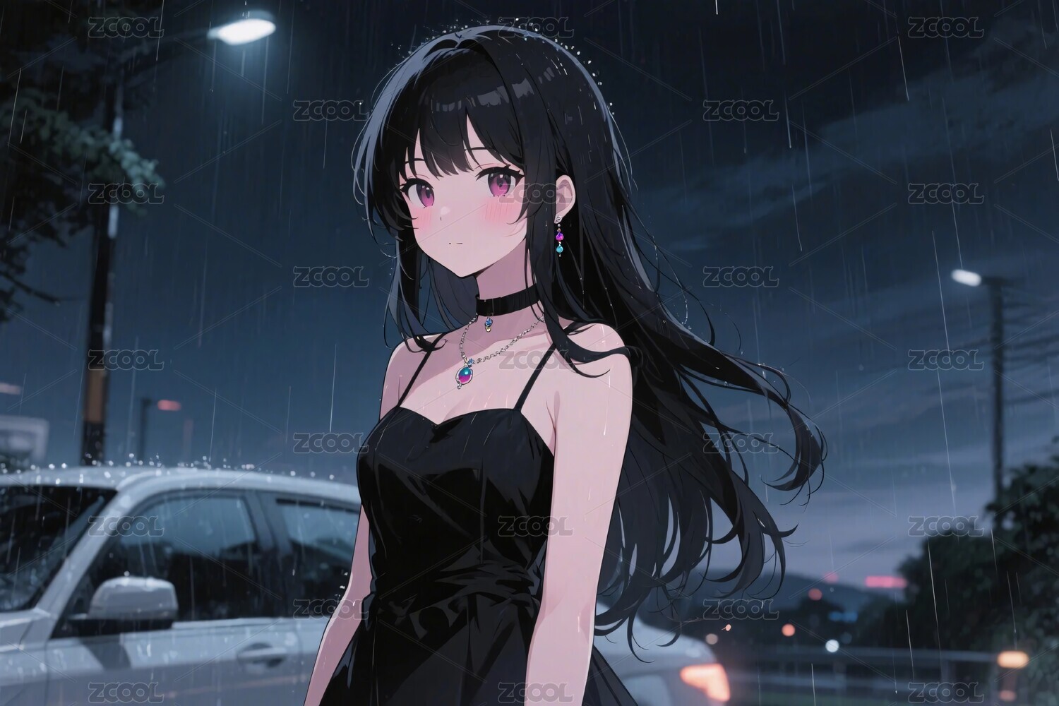 动漫女性,雨夜,夜景,女生,黑色礼服,汽车,雨景,哥特风,插画,表情