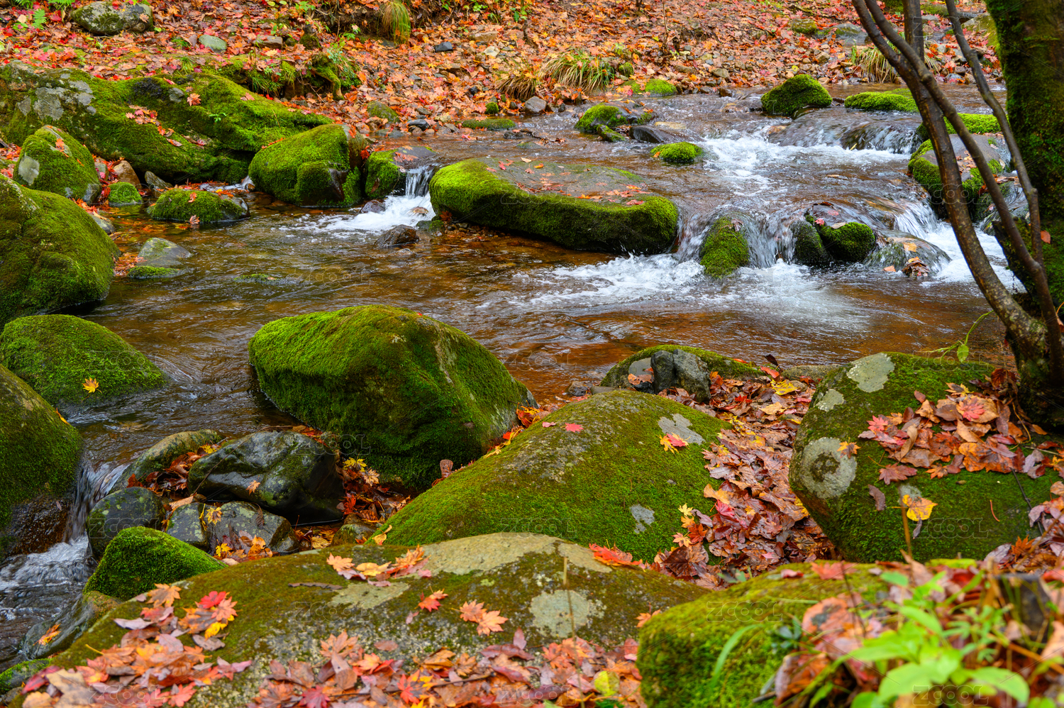 沈阳本溪老边沟,秋季石头溪流落叶自然风光