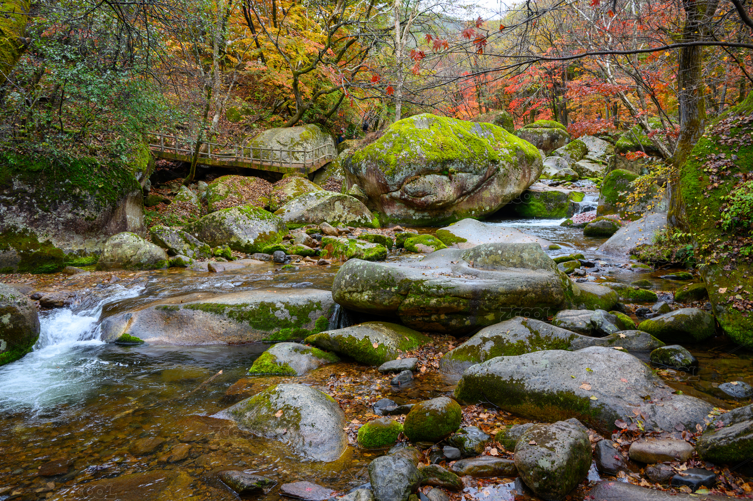 沈阳本溪老边沟,秋季枫树红叶溪流自然风光