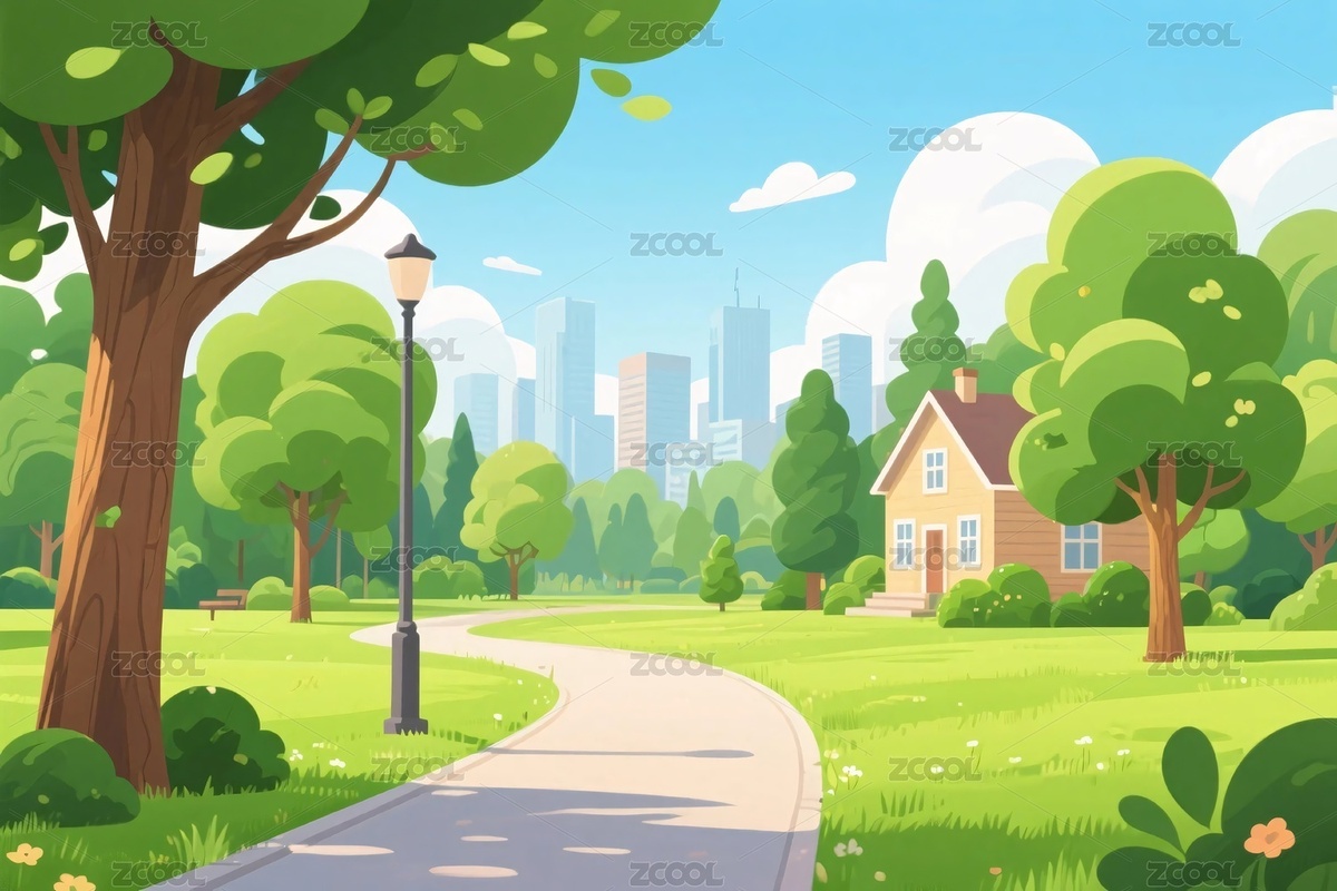 卡通风景,户外场景,公园小径,绿树,房屋,草地,路灯,城市景观,蓝天,云朵