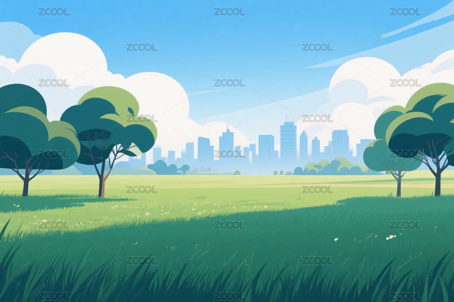 卡通城市公园绿树与高楼景观插画