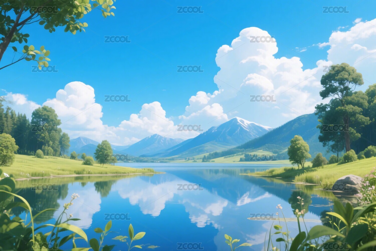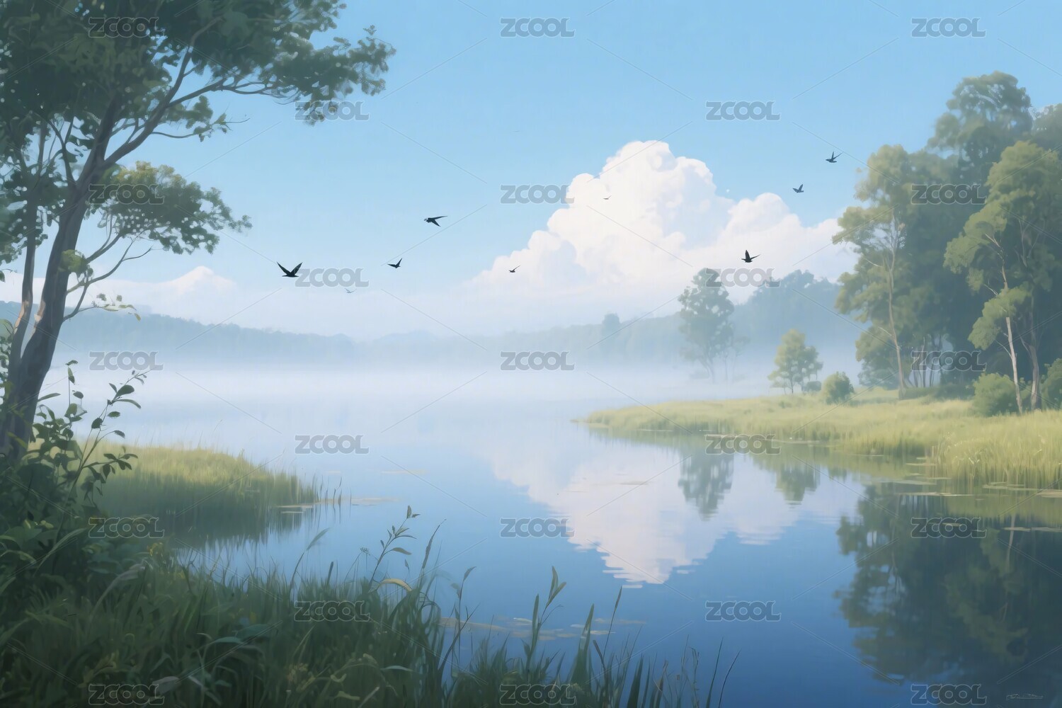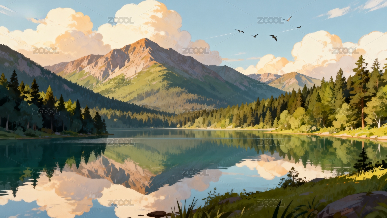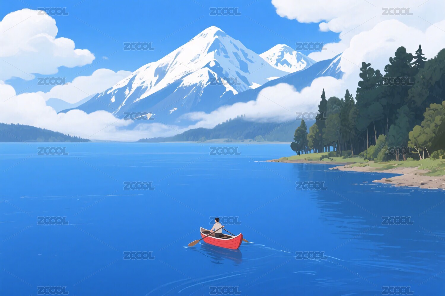 湖水,小船,码头,山脉,树木,风景,风景画,自然,宁静,插画