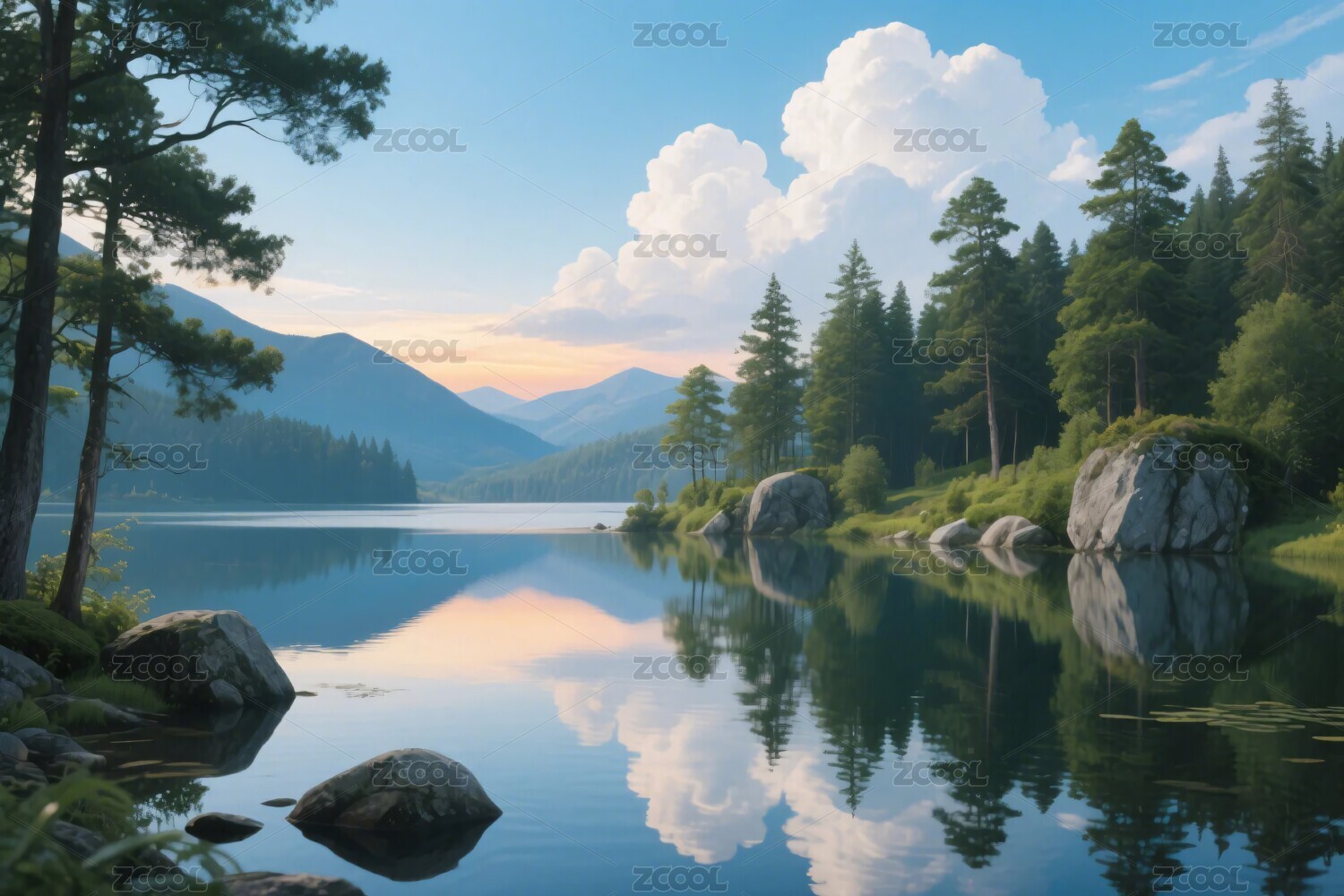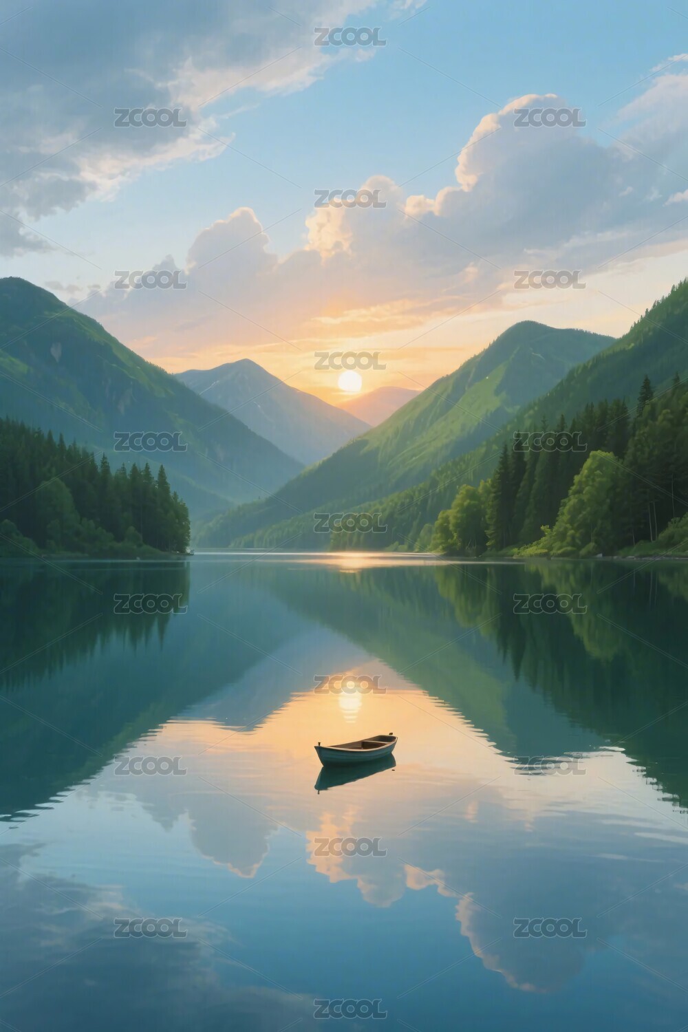 湖面,码头,小船,山水,森林,宁静,风景,自然,插画,矢量