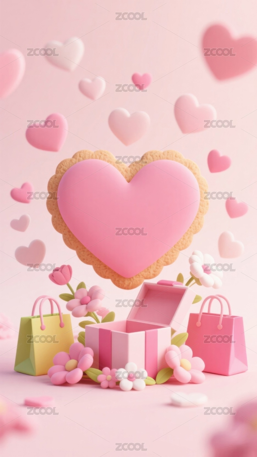 粉色心形饼干与购物袋的浪漫场景
