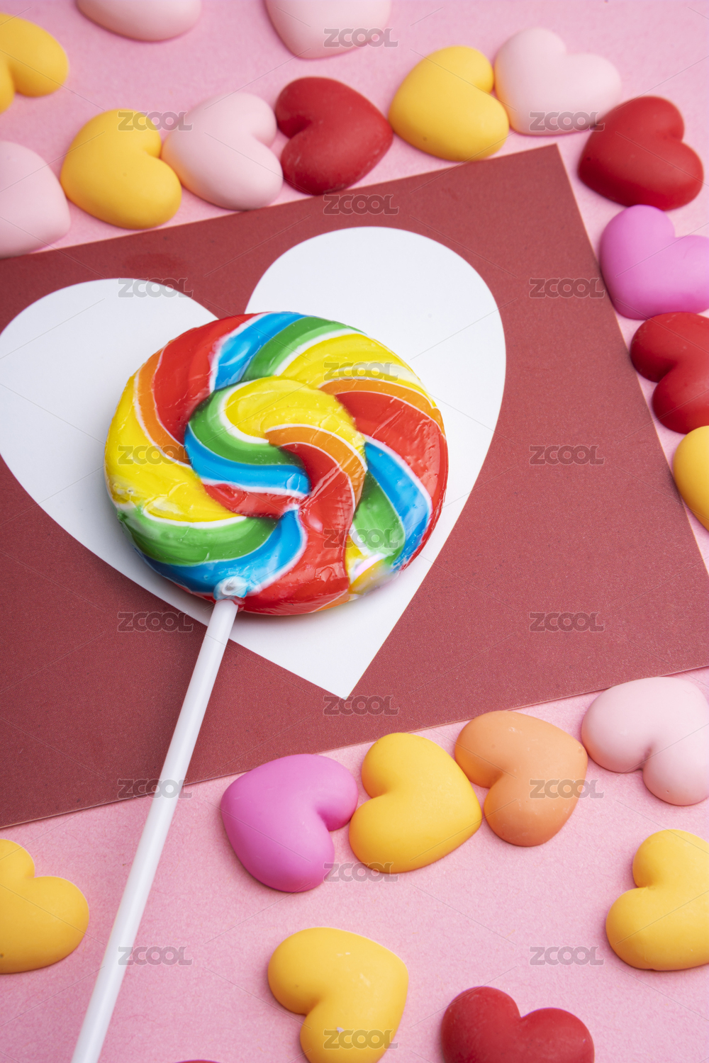 爱心糖果上放至的情人节贺卡与棒棒糖