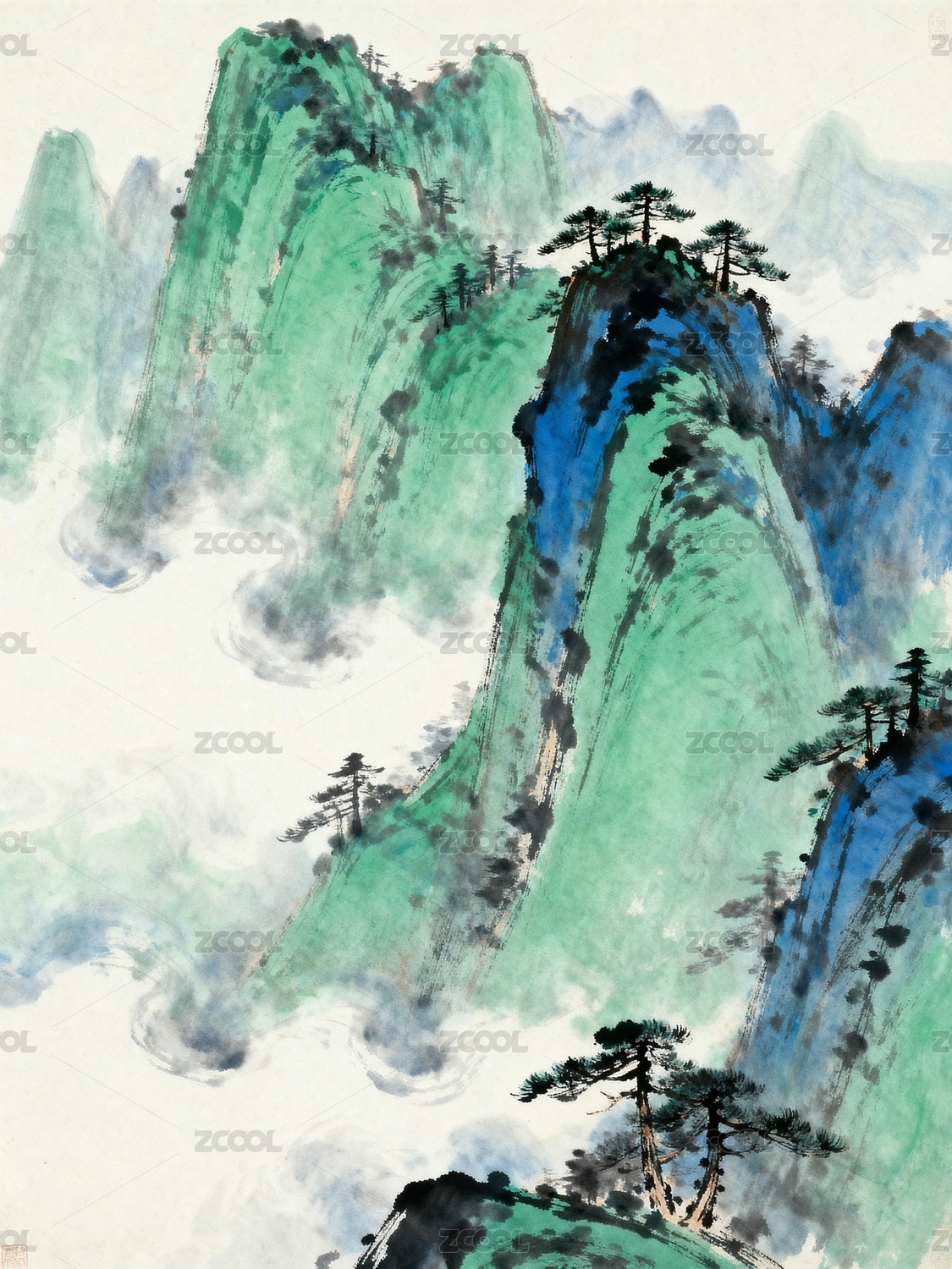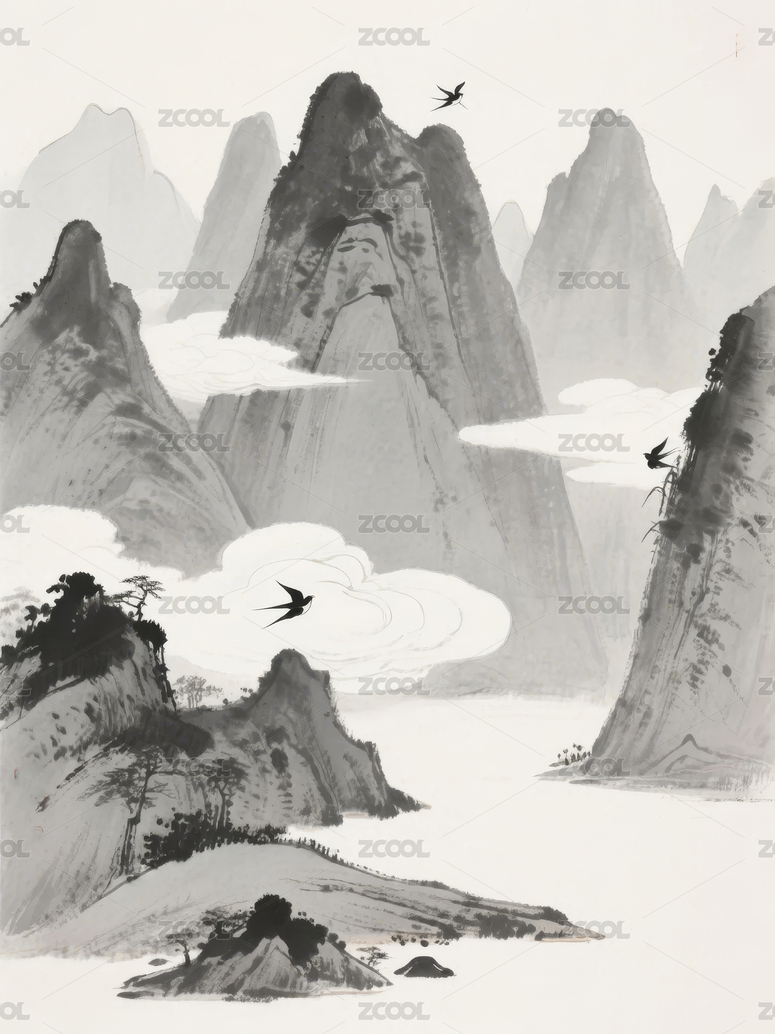 自然, 水墨, 传统, 远山, 意境, 飞鸟,山水, 山峰, 云雾, 中国画
