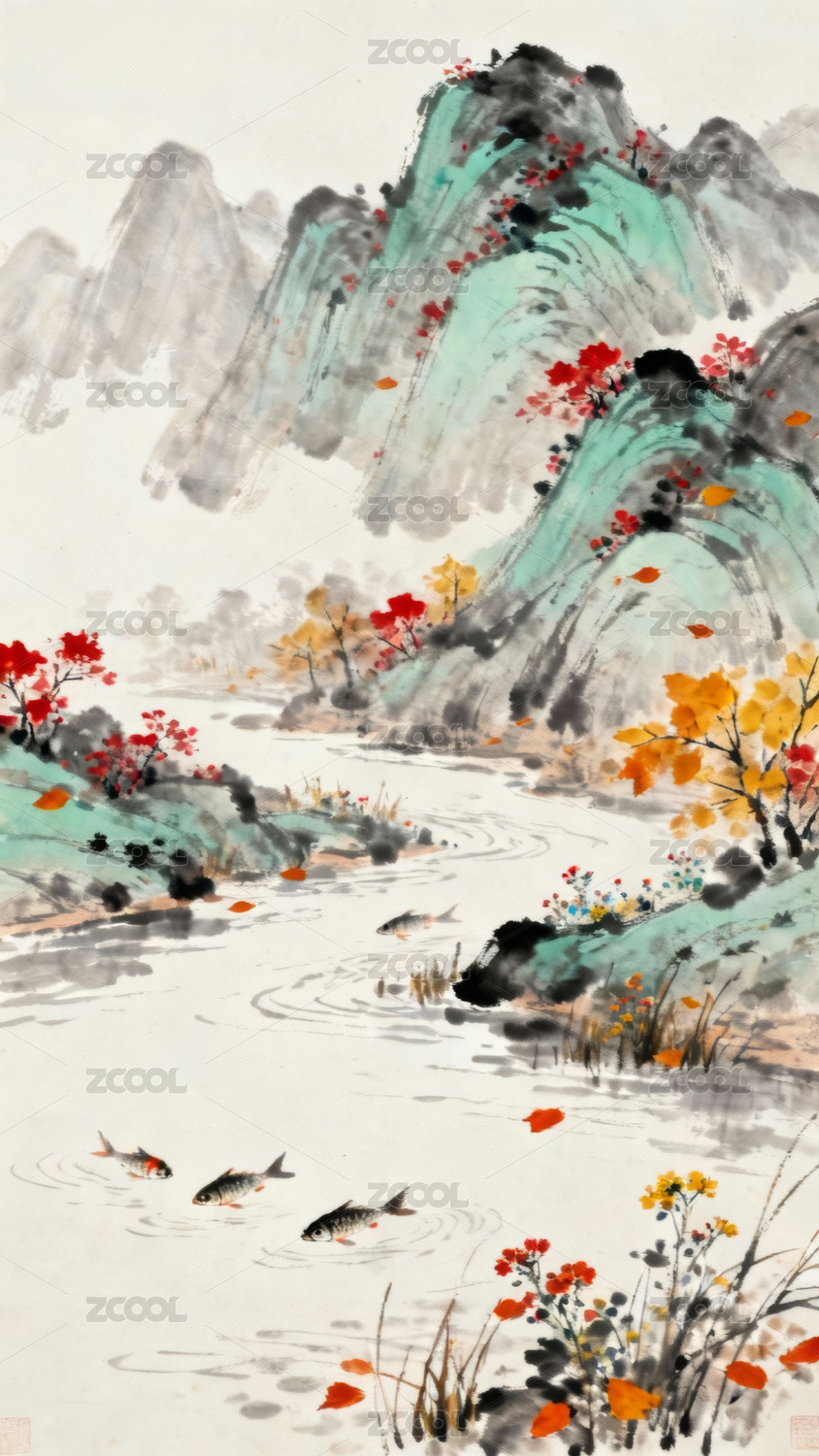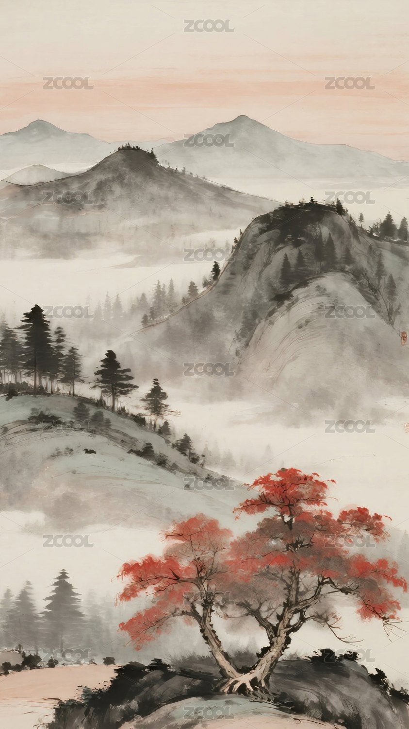 山间红叶水墨意境秋山红树云雾缭绕山水国画