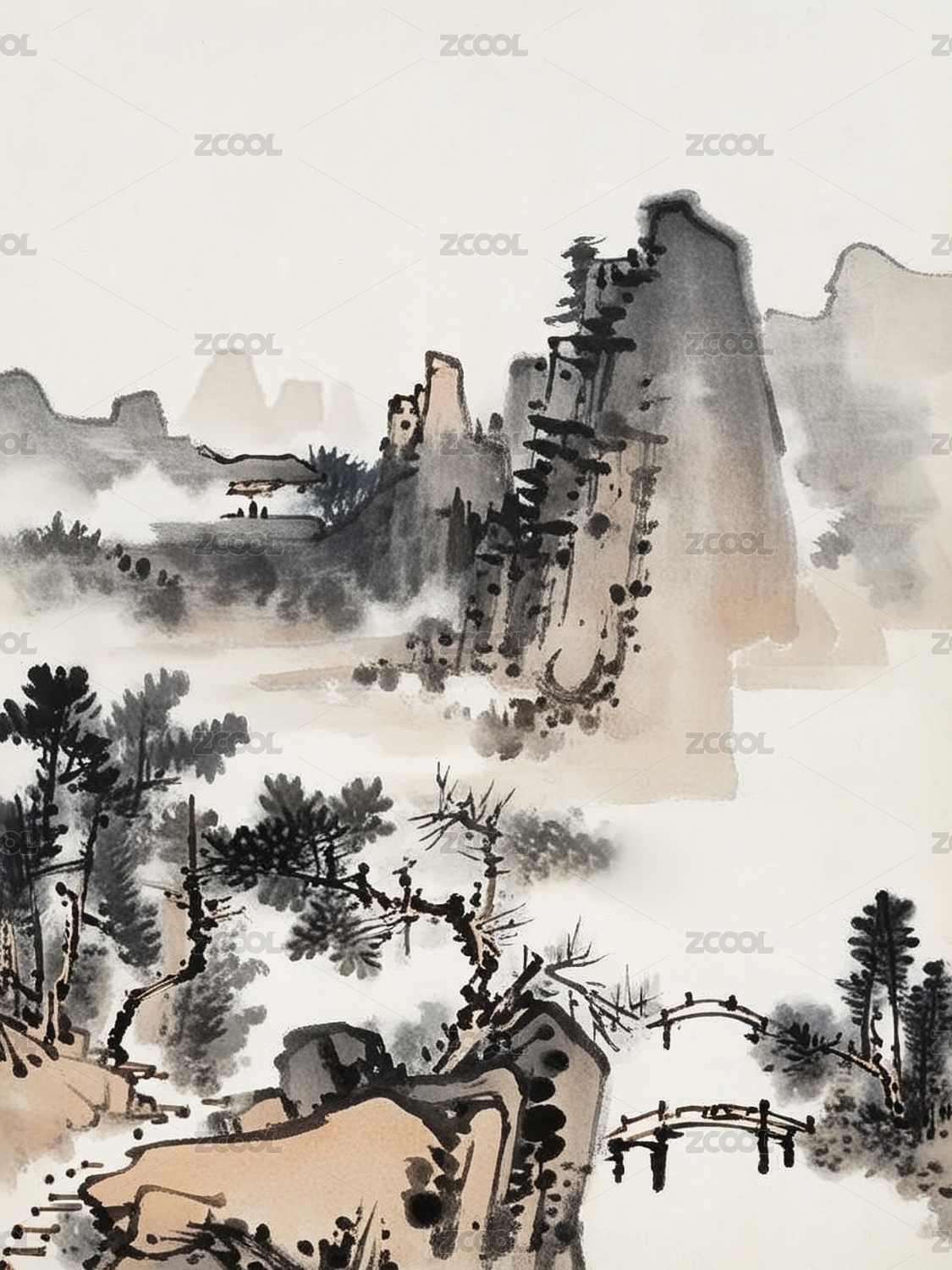 传统, 自然, 风景, 水墨, 意境, 远山, 朦胧, 山峰, 云雾, 树木