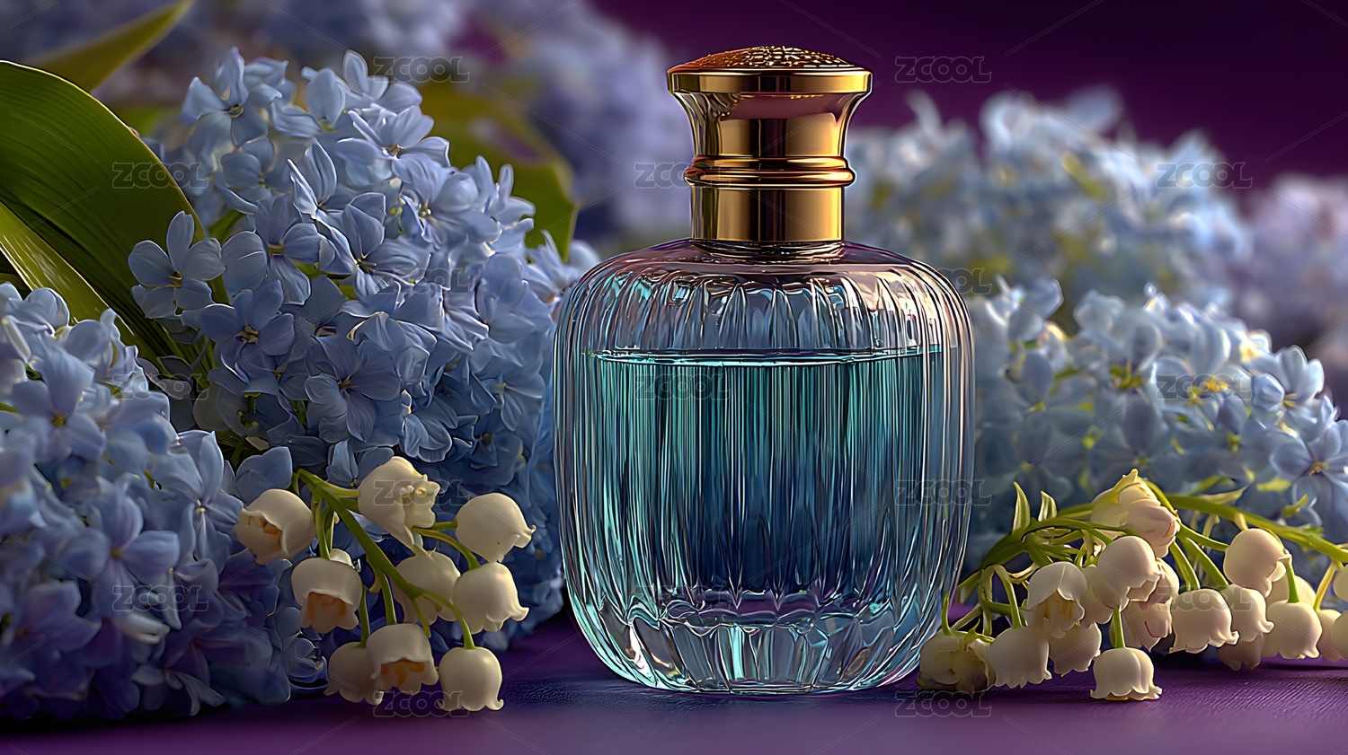 香水瓶置于紫色花丛中