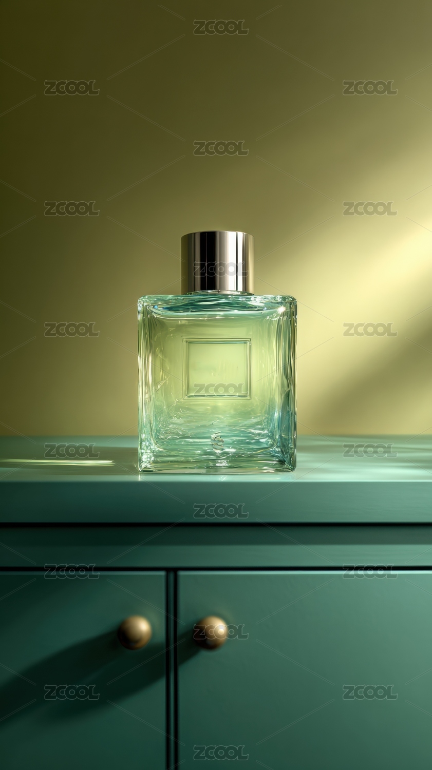绿色柜上的透明香水瓶