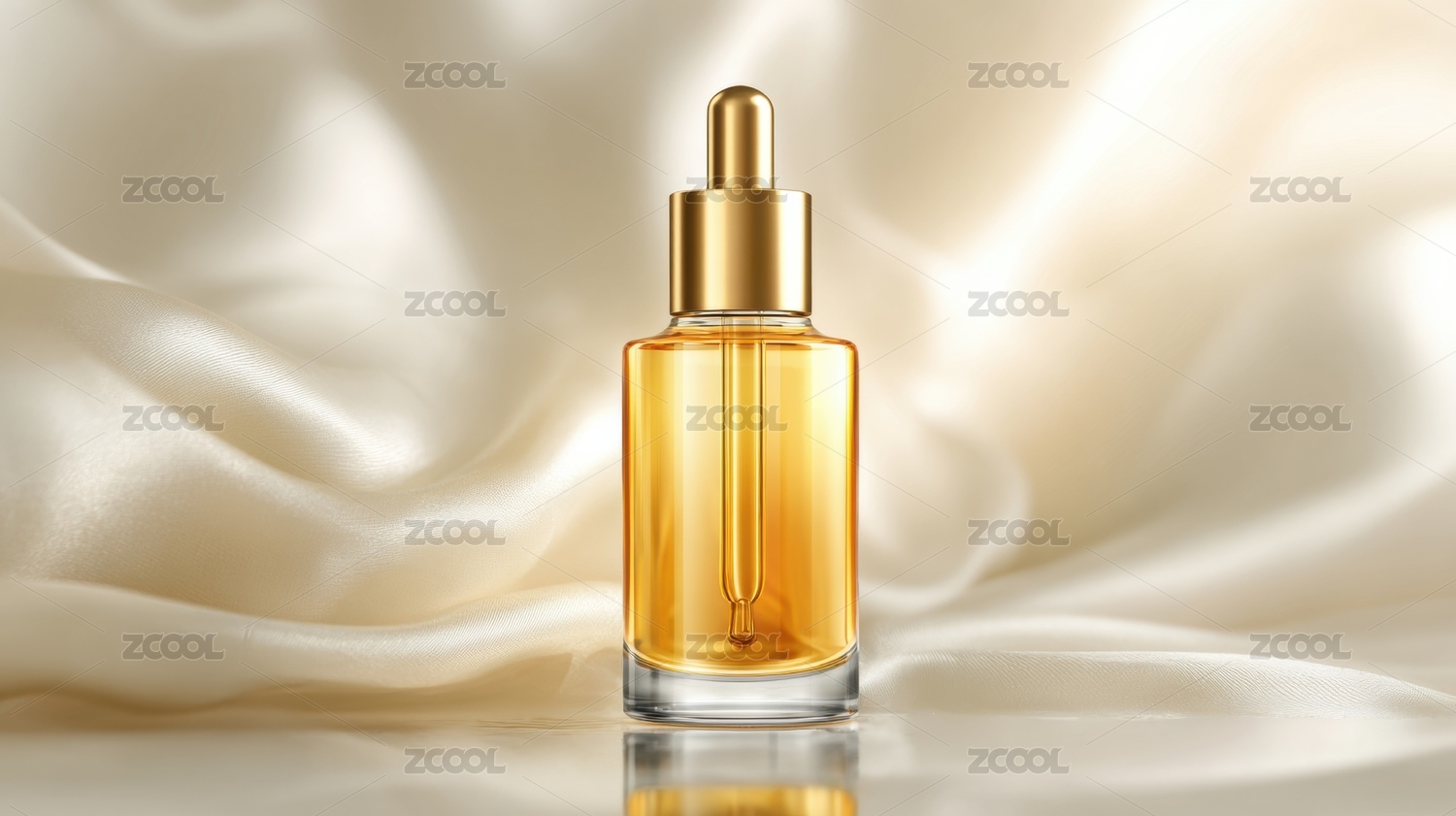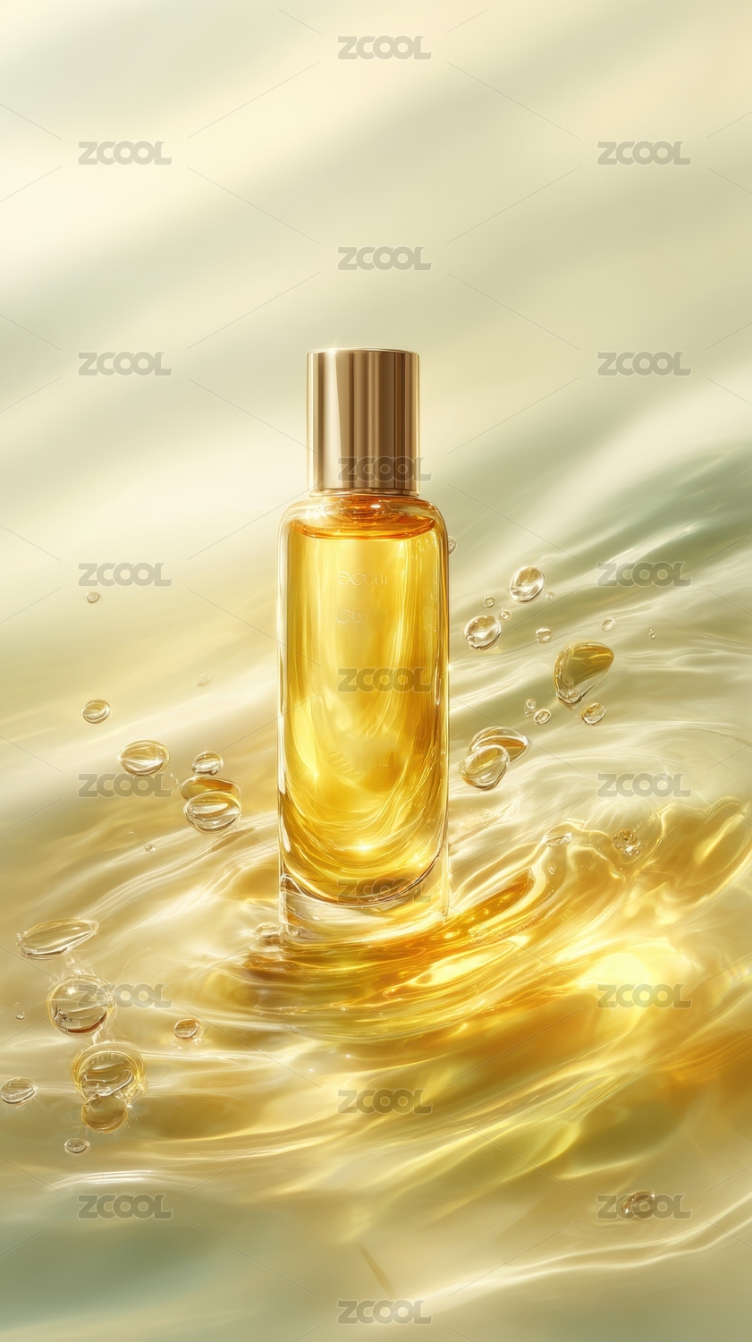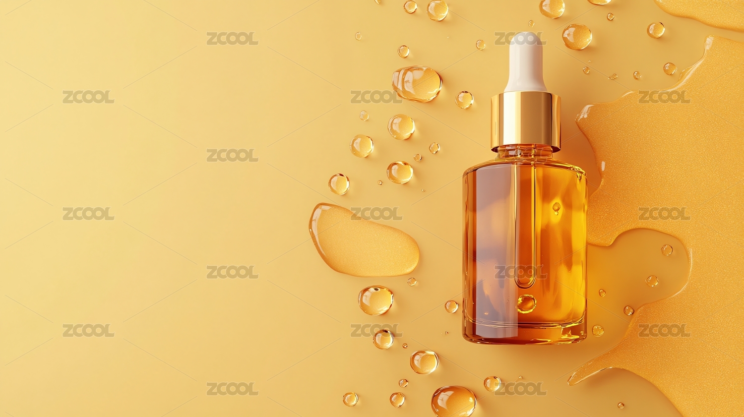 精华液,玻璃瓶,金色液体,滴落效果,透明材质,美容产品,护肤概念,简洁背景,高端质感,现代设计