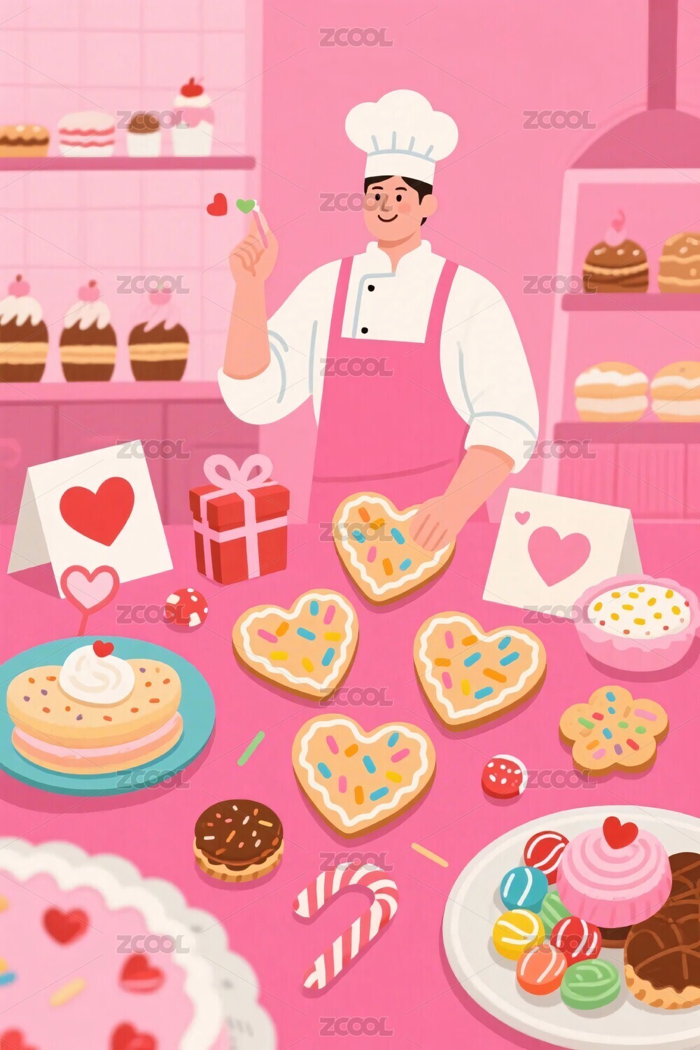 厨师,饼干,礼盒,甜点,蛋糕,甜品,粉色调,卡通风格,插画,烘焙