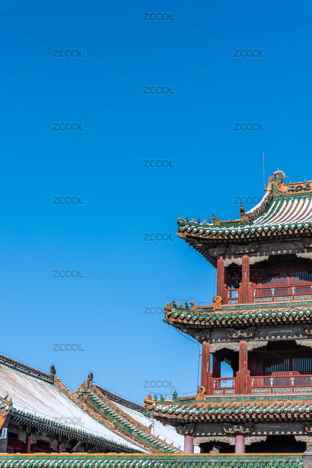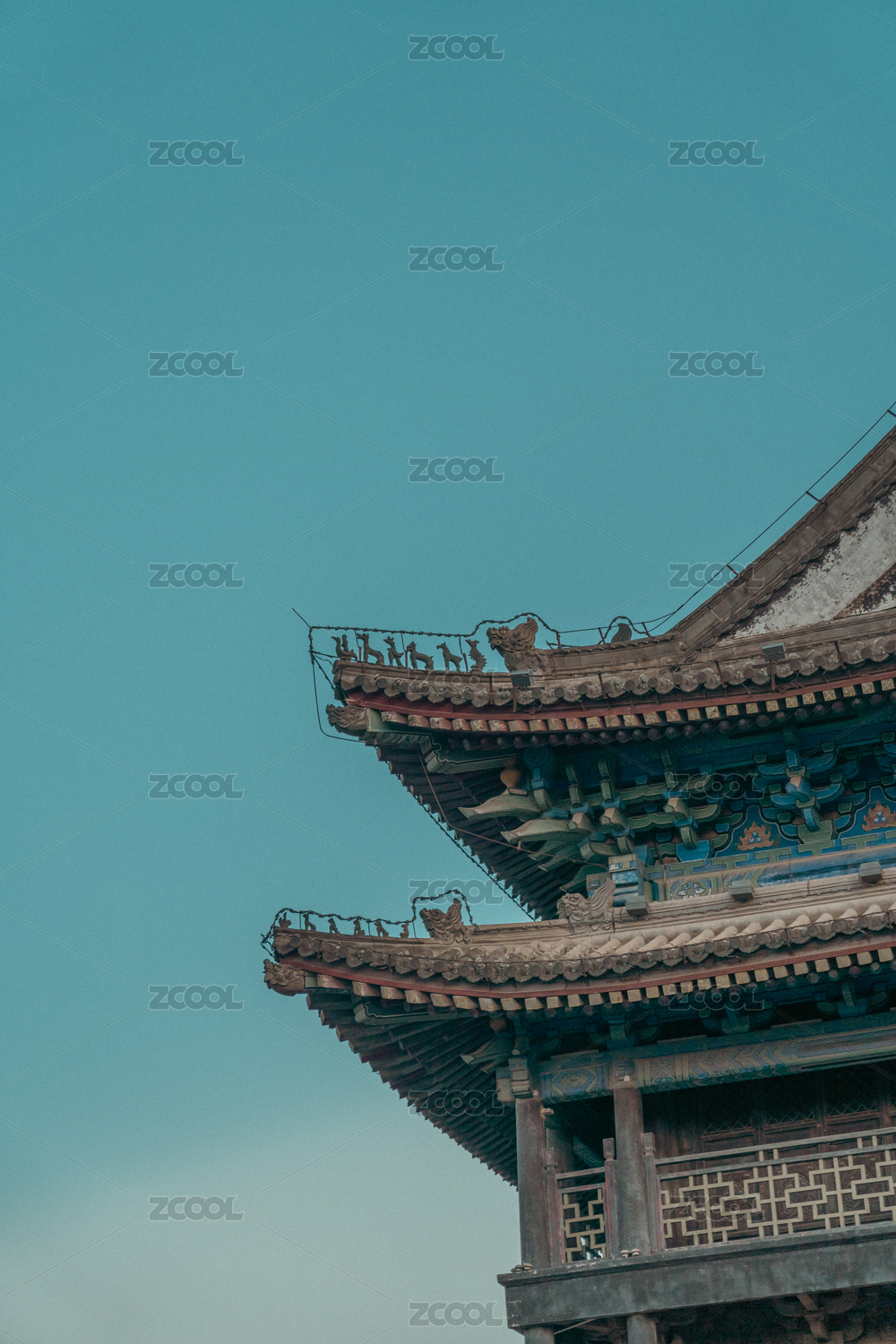 蓝天下的北京中山公园宰牲亭屋顶房檐特写