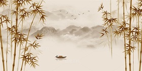 新中式竹鸟山水画背景