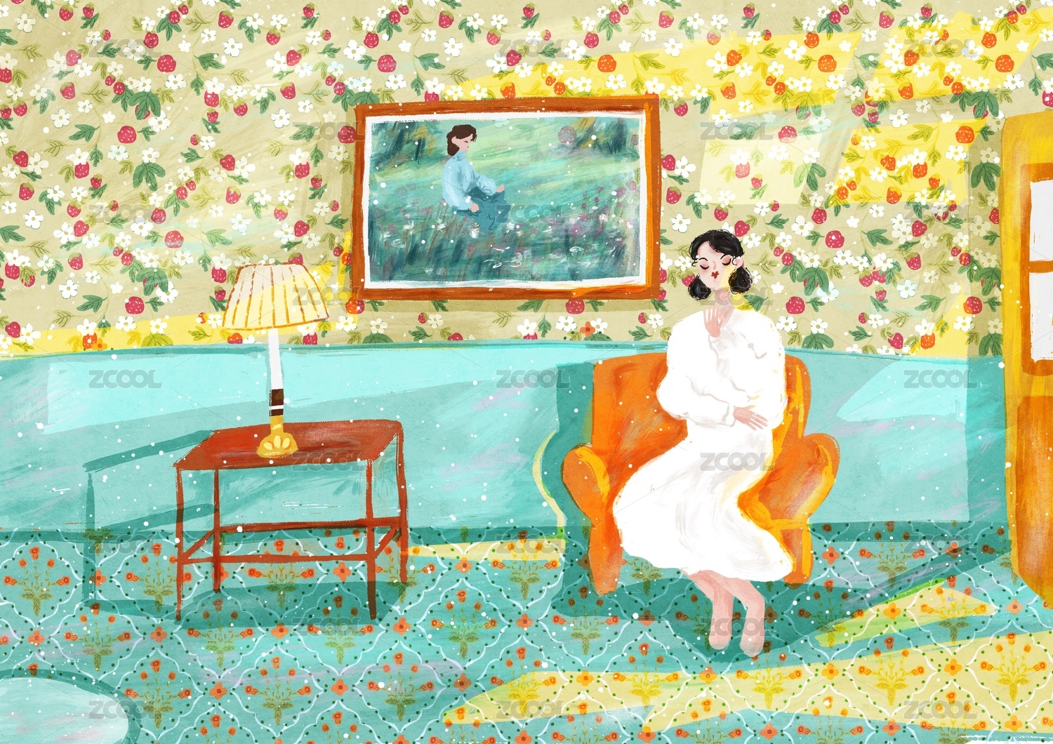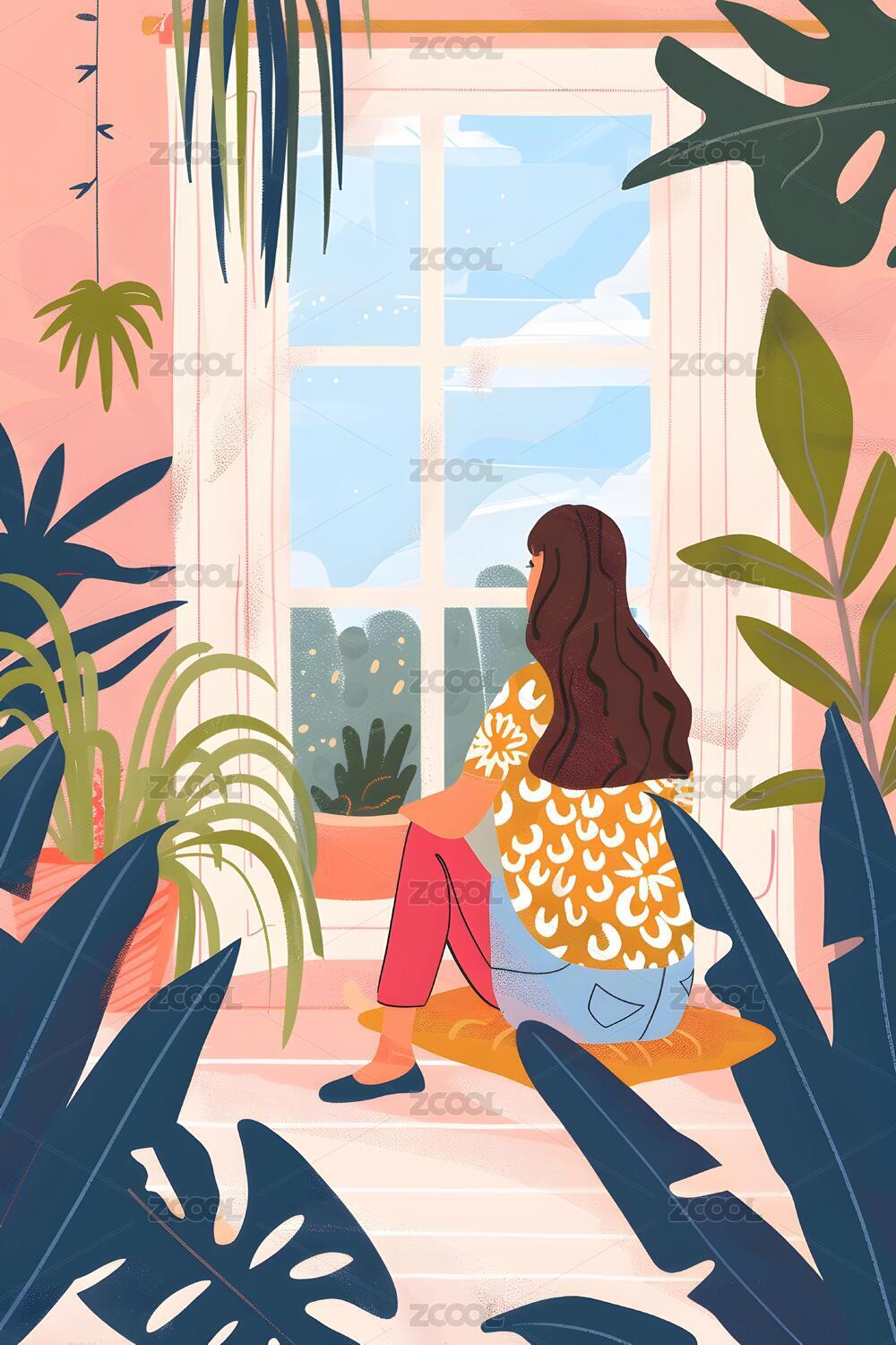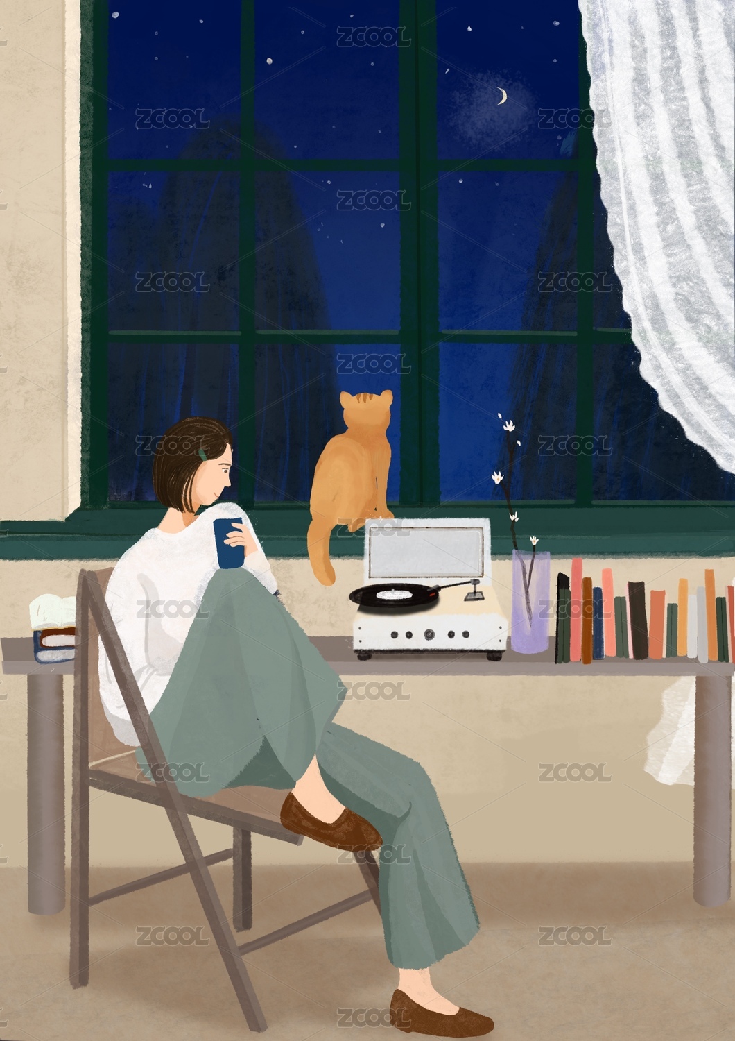 插画,韩系风格,治愈,独居,女孩,慵懒,坐着,窗前,书本,夜晚