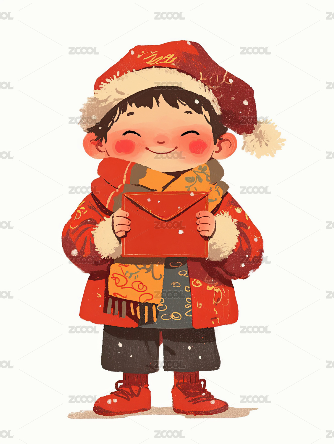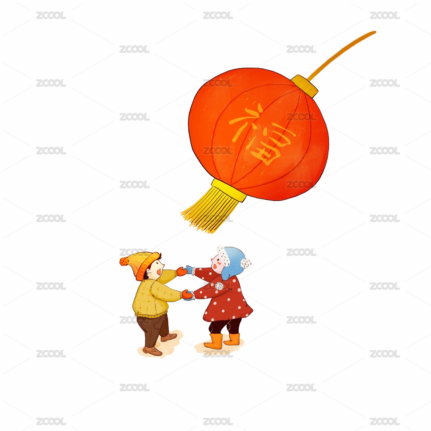 插画,卡通,装饰,儿童,红衣,冬装,帽子,围巾,灯笼,春节