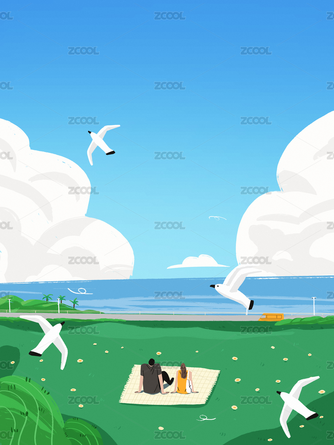 坐在草坪看海的情侣