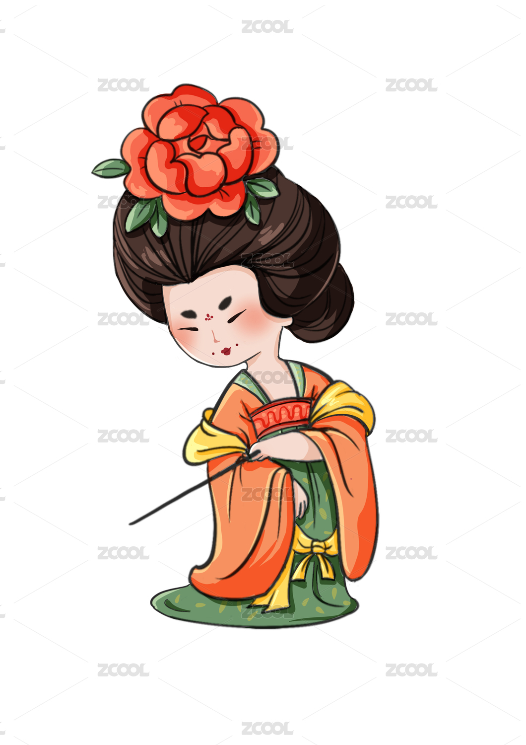 头戴大红花的可爱唐代仕女,国潮插画