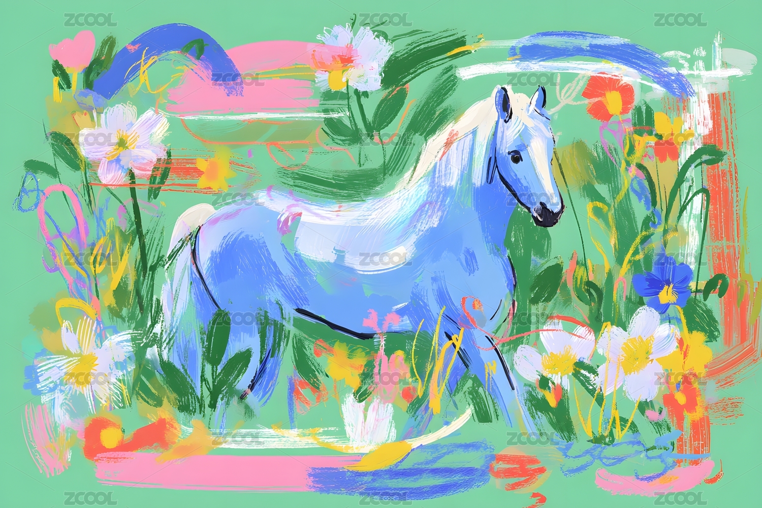 彩绘蓝马鲜花背景