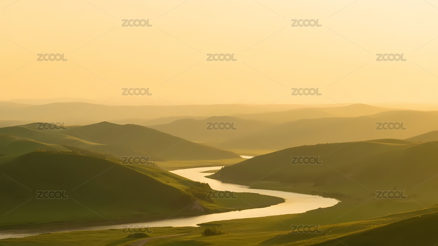 河流山丘映衬黄色天空